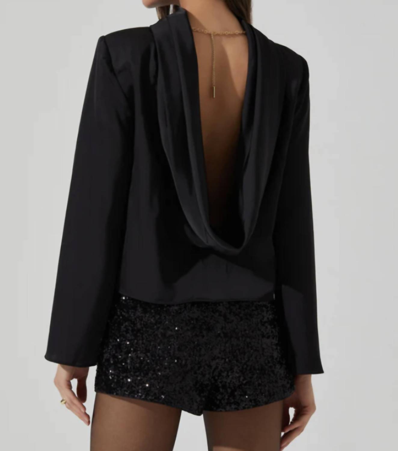 Pair this with your favorite jeans and slides for your next girls night out. Elevate your evening attire with the Bethwyn Cowl Back Top by ASTR, a sophisticated choice for cocktail parties and special occasions. This black satin blouse boasts long sleeves and a chic cowl neck, complemented by a removable gold chain detail for a touch of quiet luxury. Crafted without pockets, it features a pull-on closure for ease and comfort. Care instructions specify dry cleaning to maintain its elegant look.