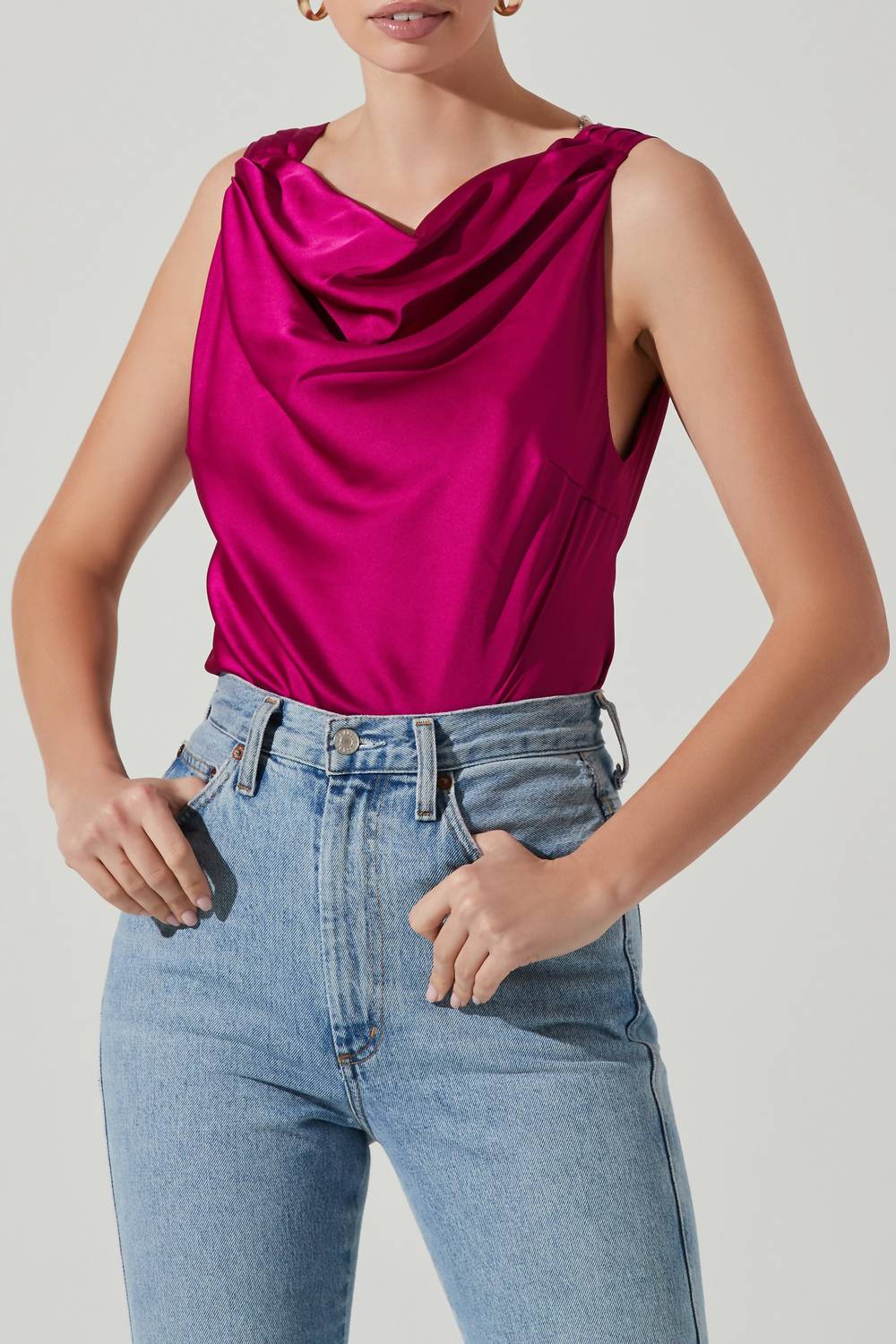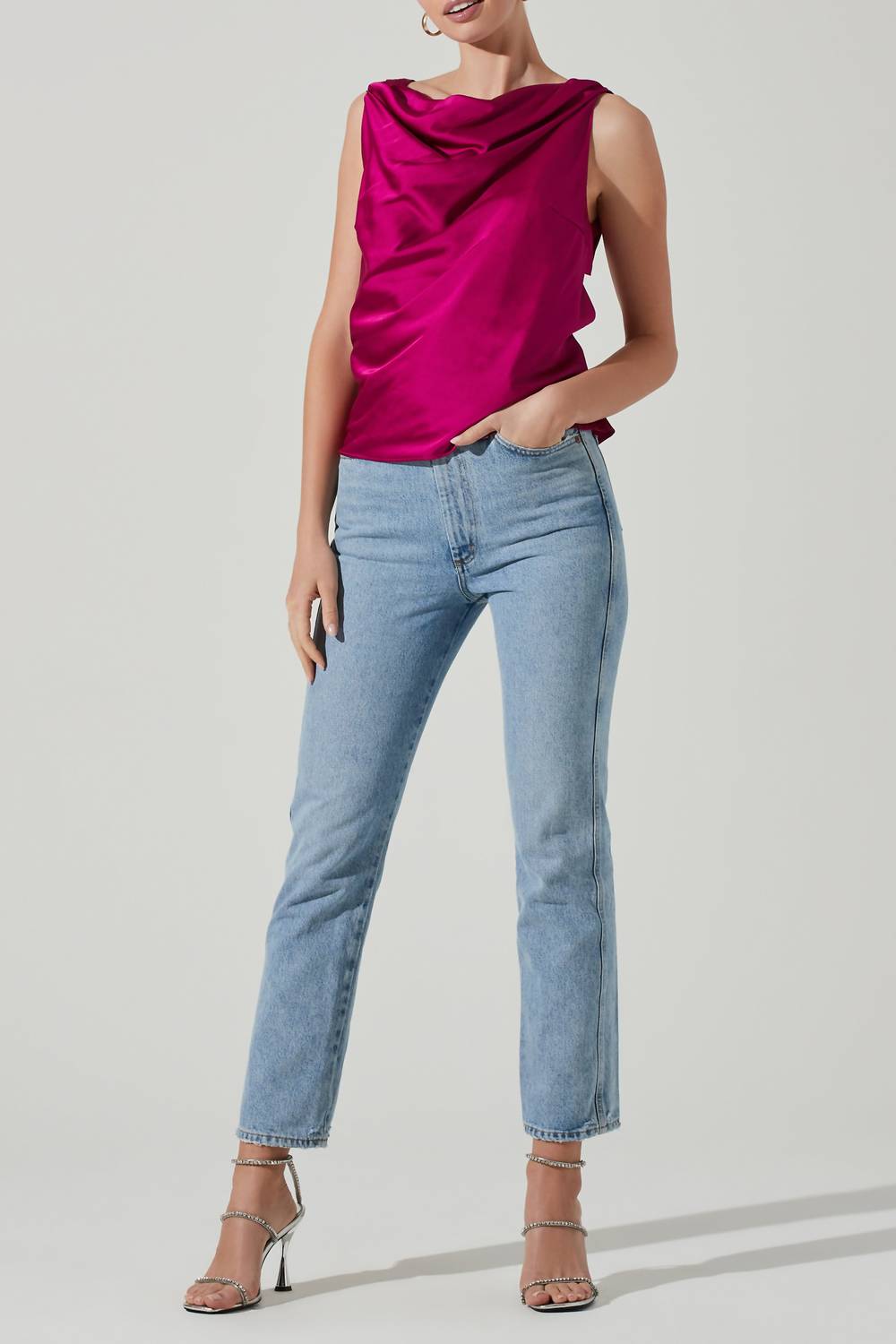 This classic tank top is perfect for layering and cute enough to wear on its own. Introducing the Brisia Embellished Top by ASTR, a chic piece perfect for standout style with its captivating cowl neckline and sleeveless design. Crafted from 100% polyester with a sleek satin finish, it features an alluring open back with three detachable rhinestone strap embellishments. This tank top, designed in a vibrant hue, is a statement piece for any summer event. With a convenient pull-over style and chain detail, it's best cared for with dry cleaning to maintain its luxurious look.