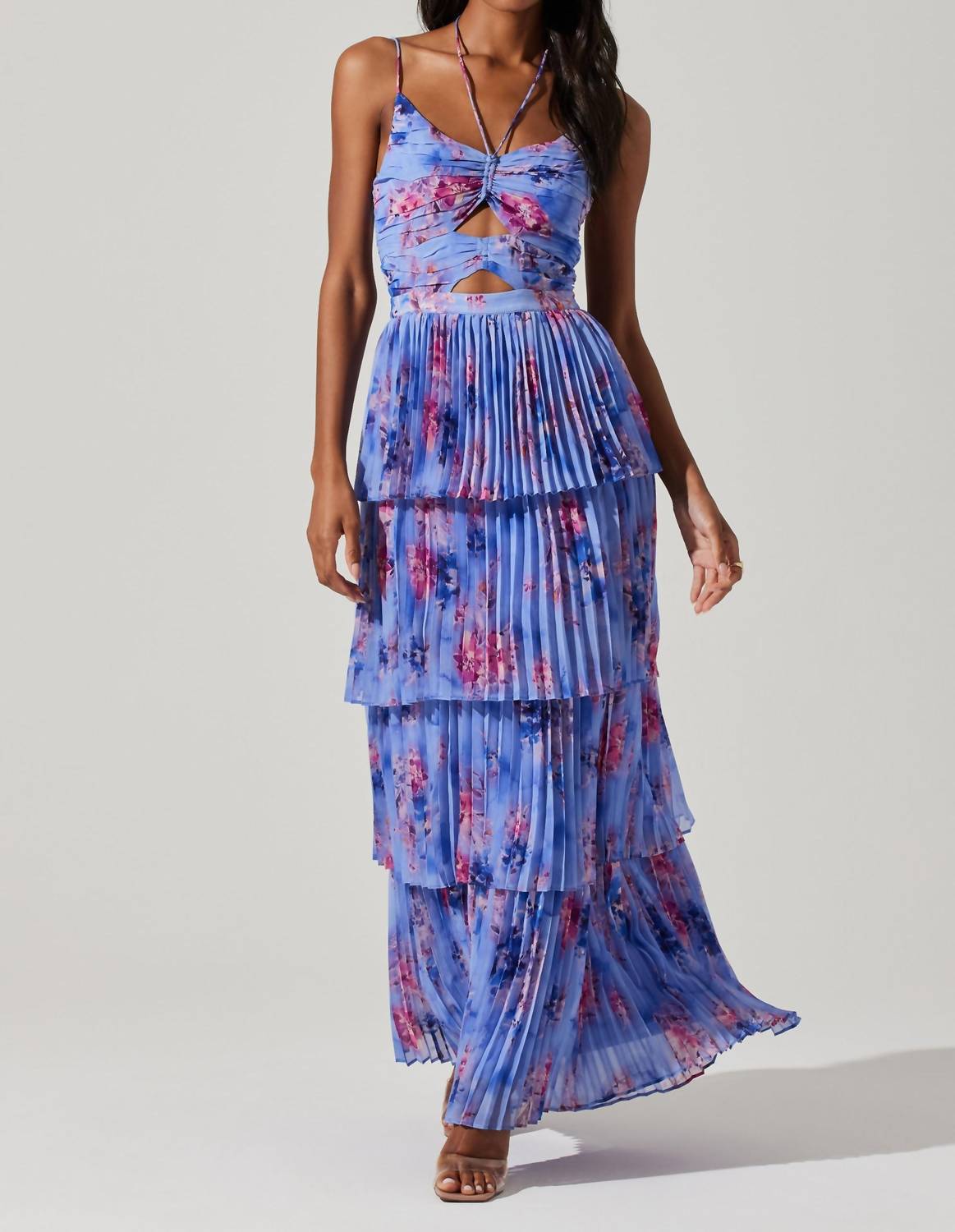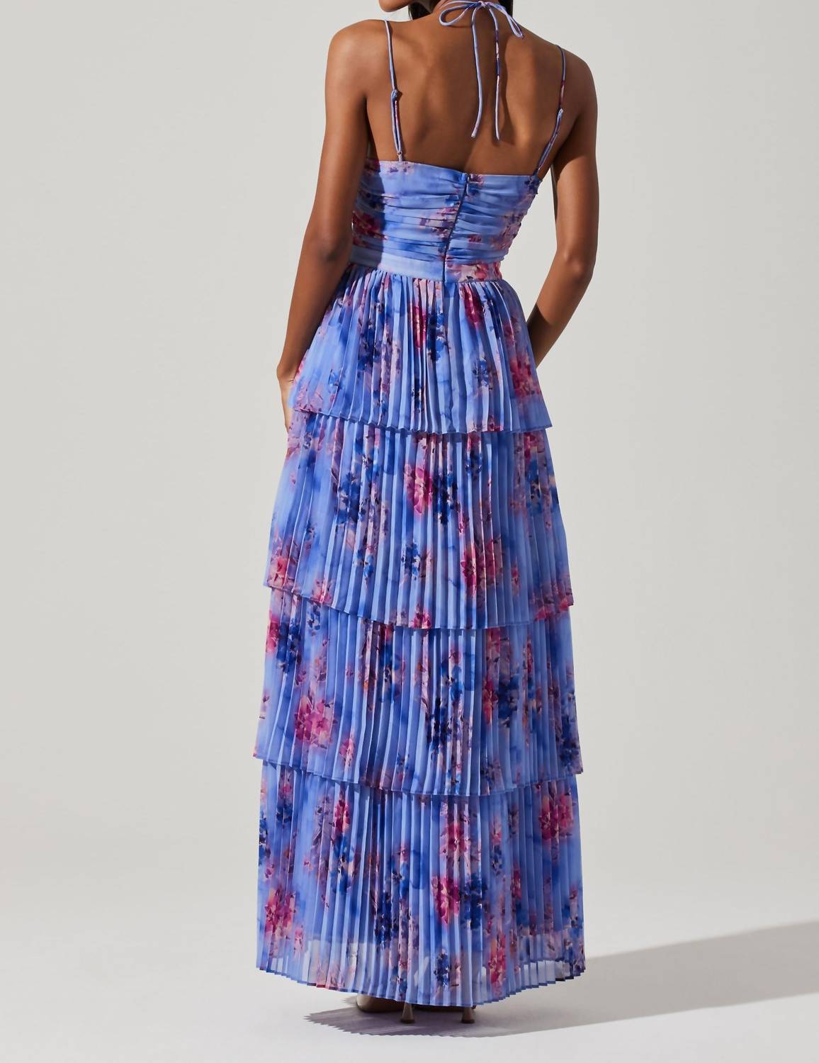 Who doesn't love a good maxi dress? This one you'll be reaching for season after season. Embrace elegance with the Daytona Pleated Floral Maxi Dress by ASTR, showcasing a stunning pleated floral design in periwinkle pink. Featuring delicate spaghetti straps and a halter neckline, this fit-and-flare silhouette offers a touch of sophistication with cutouts on the bodice. Crafted from 100% polyester and measuring 58 inches in length, it ensures comfort with its fully lined construction. Closure: Concealed zip. Care: Dry clean only.