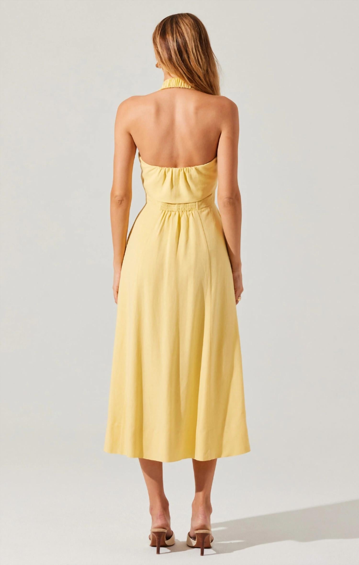 A midi dress so versatile, your options for wearing it are endless. Capture the essence of summer with the Katherine Halter Dress by ASTR, a stunning midi dress in a refreshing pale yellow hue. This sleeveless piece, crafted from a breathable blend of 75% viscose and 25% linen, features an elegant halter neckline with an elasticized back and a boned bodice for enhanced structure. Practical and stylish, it showcases a flattering fold-over bow at the bust, a button closure, side pockets, and a chic left leg slit above the knee. Fully lined for comfort, it's ideal for summer soirees, adding sophistication with every wear—just remember it's dry clean only.