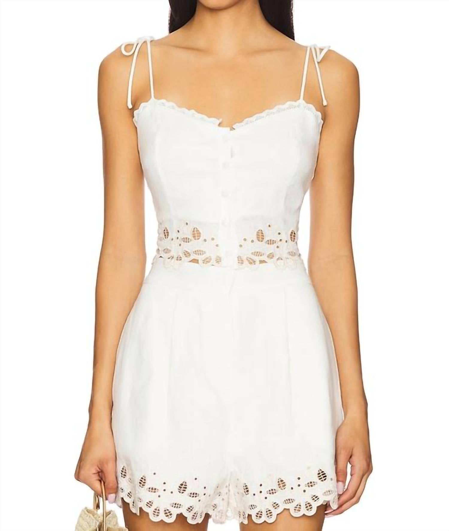 Show a little skin in this cute and casual crop top. The Kiya Sleeveless Top by ASTR is a minimalist crop top perfect for spring vacations. Featuring delicate spaghetti straps and a charming sweetheart neckline, this piece is crafted from 100% linen for a breathable feel. Originating from China, this solid white top secures with a button closure for easy wear. Care for it by dry cleaning as needed.