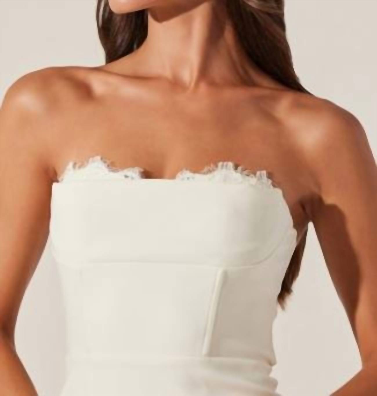 The perfect mini dress for those warmer months. Elevate your style with the Melani Mini Dress by ASTR, a stunning off-white sheath dress perfect for any occasion. This sleeveless design features a lace peekaboo bra insert and supportive grip tape across the top, enhanced with boning across the front and side bodice for a flattering fit. Crafted from 92% Polyester and 8% Elastane with a lining of 95% Polyester and 5% Elastane, it closes seamlessly with a concealed back zipper. Care for this dress with dry clean only to maintain its elegance. Model is wearing size S with a length of 25 1/2", bust 30 3/4", and waist 27".
