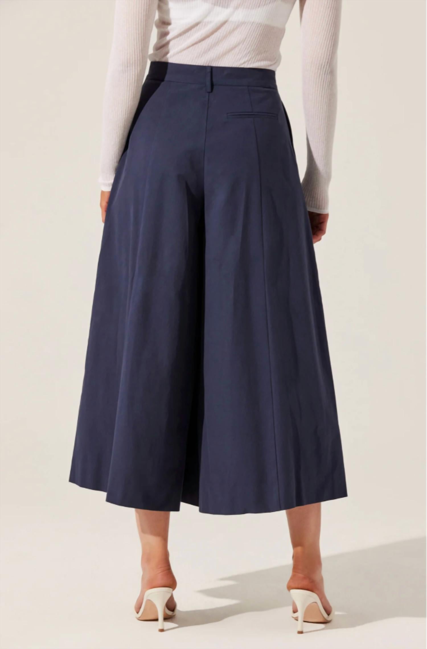 Discover the Rowen Pleated Culotte Pants by ASTR, a minimalist addition to your spring wardrobe in a solid navy hue. Designed in a high-rise, wide-leg style, these pants offer a relaxed fit that is both comfortable and chic. Made from 100% cotton, they feature convenient pockets and a secure button closure. Care: Dry clean only. With a 22-inch inseam, these culottes are perfect for vacations or Thanksgiving celebrations.