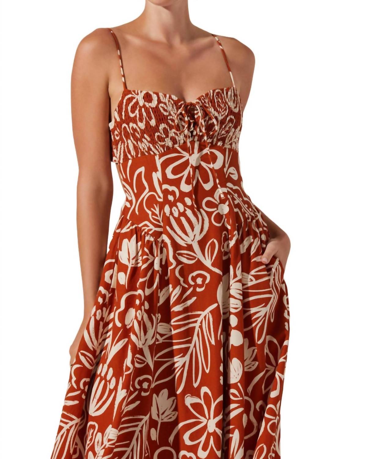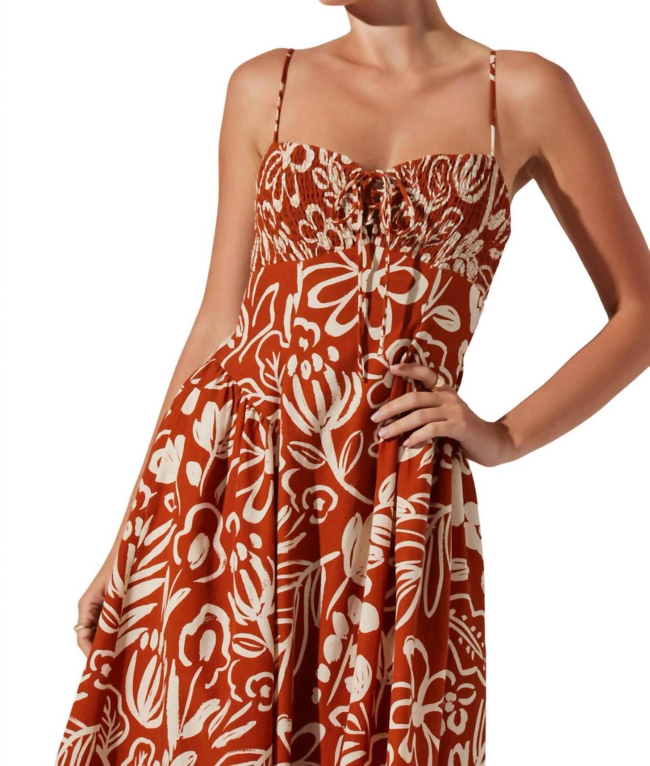 The perfect length dress does exist. Embrace effortless elegance with the ASTR Sarai Dress, featuring a charming Rust Cream Floral pattern perfect for warm-weather occasions. Designed with spaghetti straps and a playful cutout back, it offers an adjustable sweetheart neckline and a smocked bodice with front tie closure. This midi-length A-line silhouette includes practical side-seam pockets and is composed of a 70% lyocell, 30% linen blend. Imported and perfect for boho chic styling, it is ideal for Valentine's Day celebrations. Care: Dry clean only. Garment length: 51 inches.