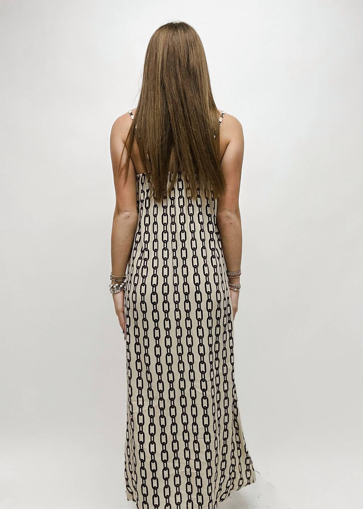 A maxi dress that is just as cute as it is comfortable. Elevate your dinner party style with the Jessica Woven Maxi Dress by ASTRID, a statement piece designed for those who embrace quiet luxury. This sleeveless A-line dress features a sophisticated cream and black anchor print pattern, highlighting the V-neckline for a touch of elegance. Made for ease of wear, it offers a pull-on closure. Perfect for summer occasions, this maxi piece is a chic addition to any wardrobe.