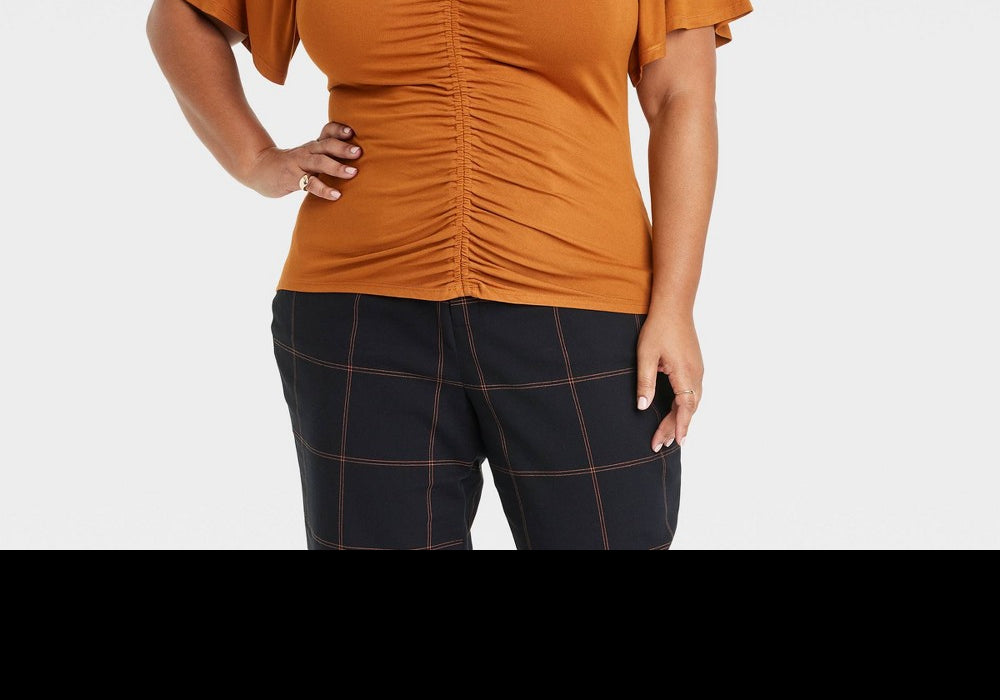 Elevate your everyday top collection with this Flutter Short Sleeve Cinched Knit Top from Ava & Viv?| This flutter short-sleeve top fashioned in a standard fit with a below-waist length features a flattering V-neck and cinched styling on the front for added flair| The soft jersey fabric with stretch offers comfy wear| while the pullover design makes dressing simple| You can coordinate this solid-color top with different bottoms to create a range of stylish looks