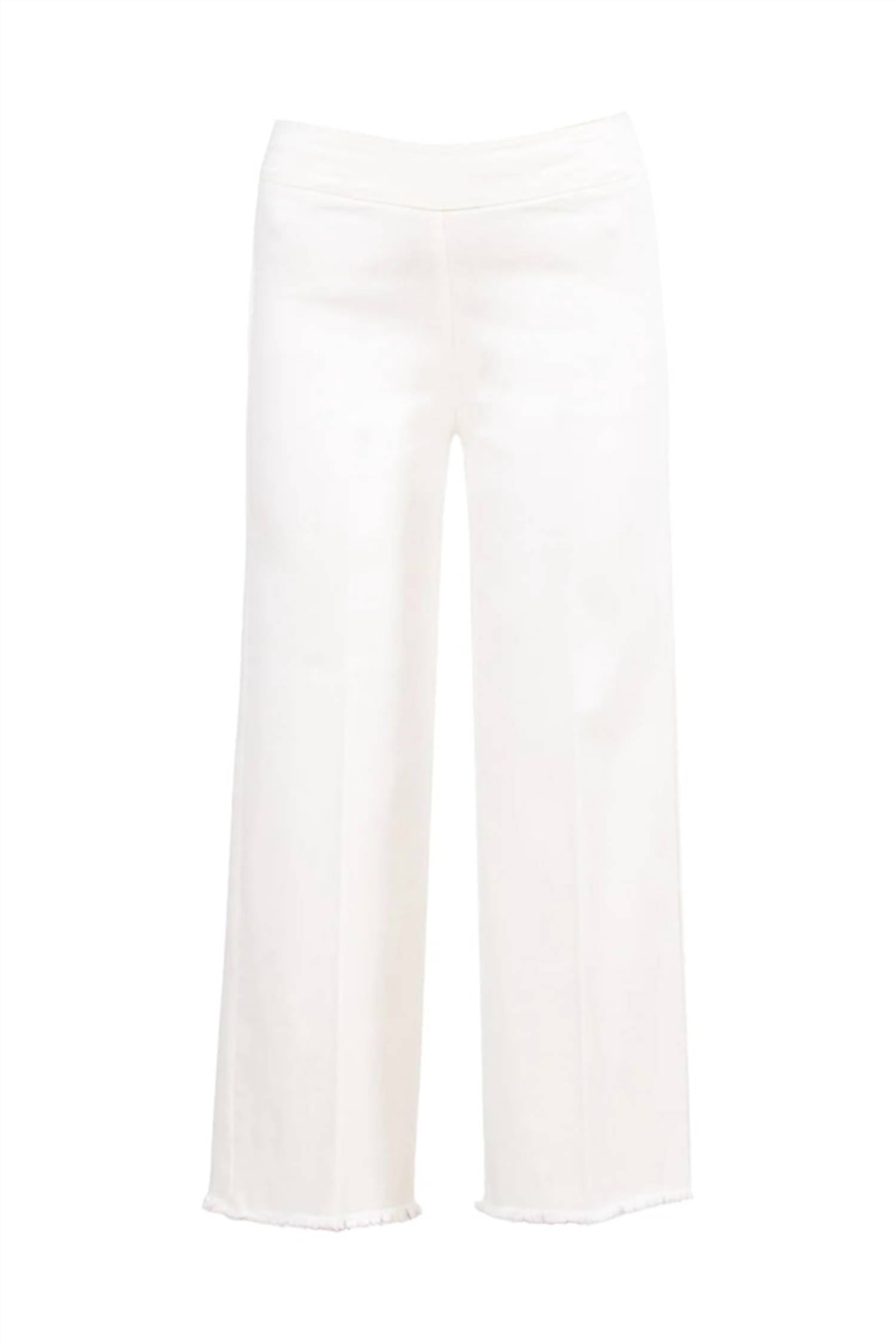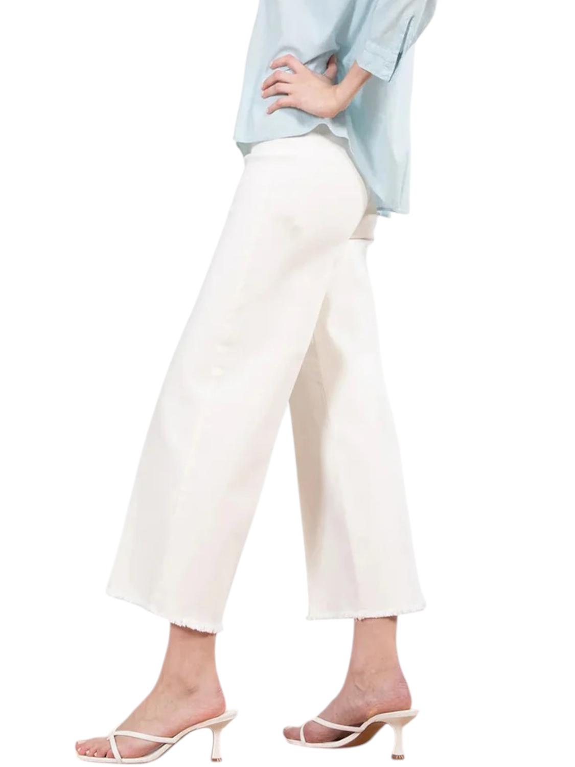 High-rise pull-on pant. Stretch denim for comfort and flexibility. Wide-leg, cropped style. Elastic waistband for a secure fit. Raw hem for a casual, unfinished look. Inseam: 25", Rise: 11", Leg opening: 19". True to size. 92% cotton, 7% polyester, 1% spandex. Hand wash. Made in the U.S.A.