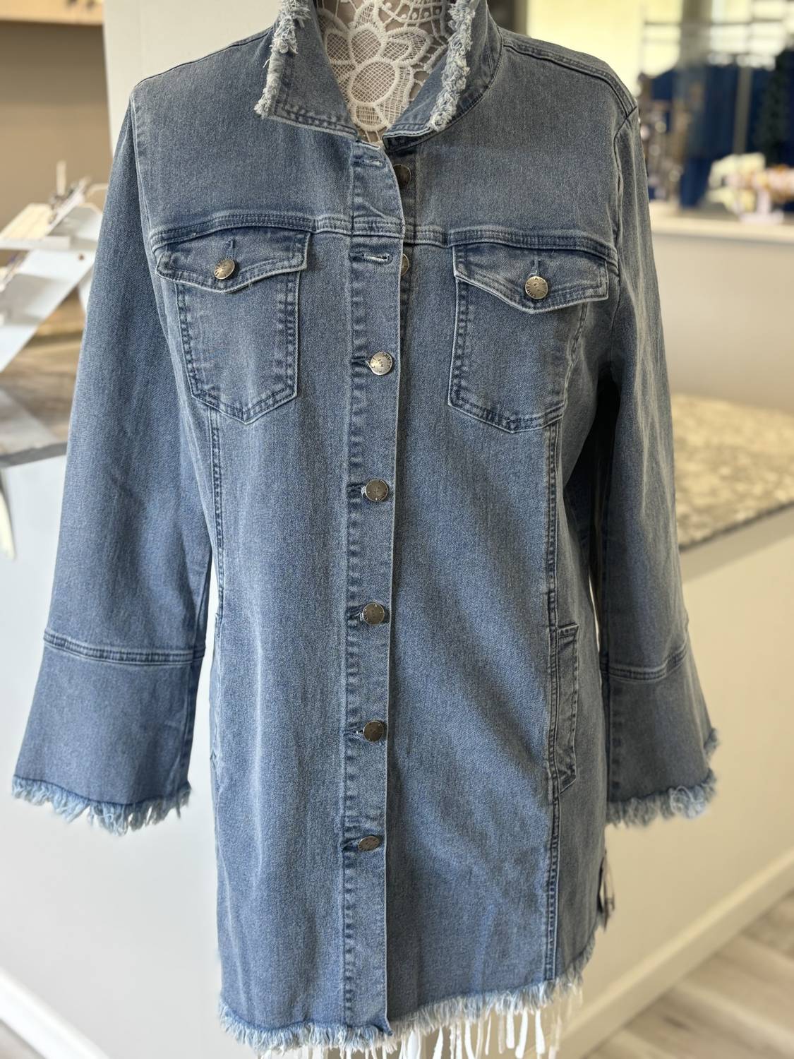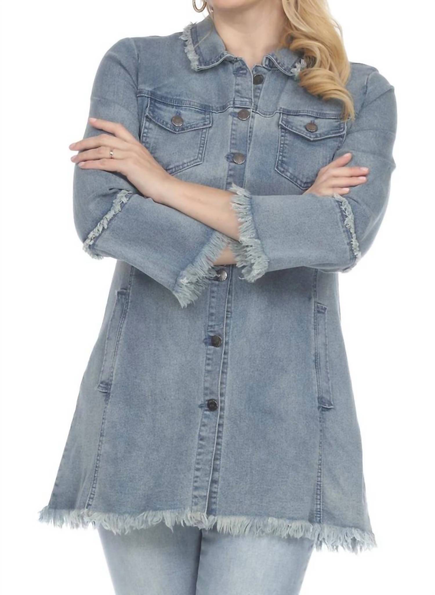 Classic, cool and works with almost any outfit choice. Streetwear staple for effortless travel styling. With its long sleeves and a chic fray hem, light wash jacket offers both utility and style with front chest and side pockets. Crafted from a blend of 72% Cotton, 26% Polyester, and 2% Spandex ensuring comfort and durability throughout the fall season. Front button closure. Machine wash and tumble dry.
