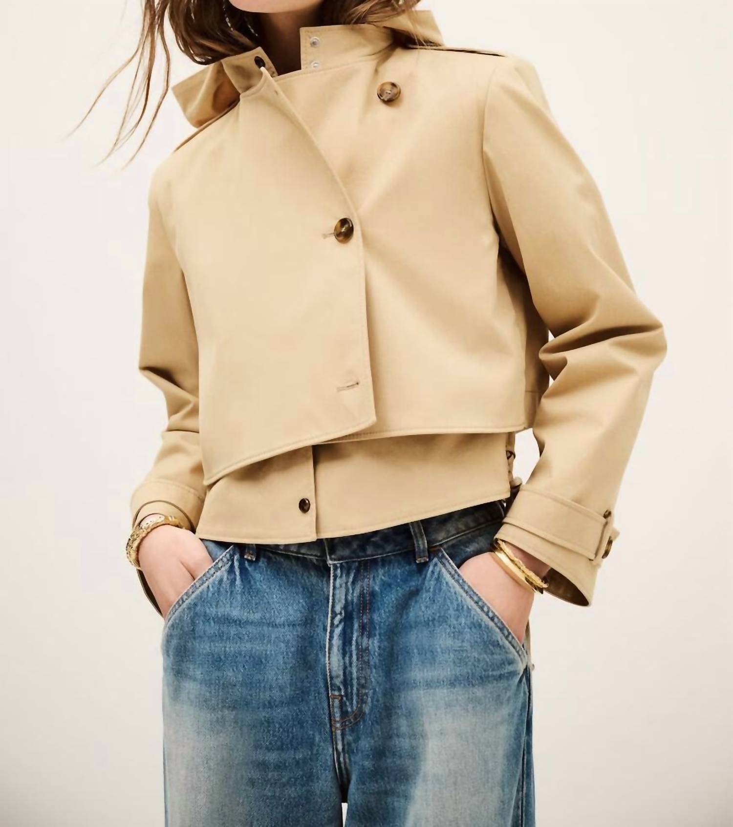 Introducing the Thym Classic Trench by ba&sh, an elegant version of the timeless trench coat in versatile beige. Crafted from a soft, high-quality composition of 98% organic cotton and 2% elastane, this piece offers both comfort and structure. The long sleeves and double-breasted button closure define its classic silhouette, while its belted waist ensures a perfect tailored fit. For practical chic, it features side pockets and is designed for transitional wear, but should be dry cleaned to maintain its premium quality.
