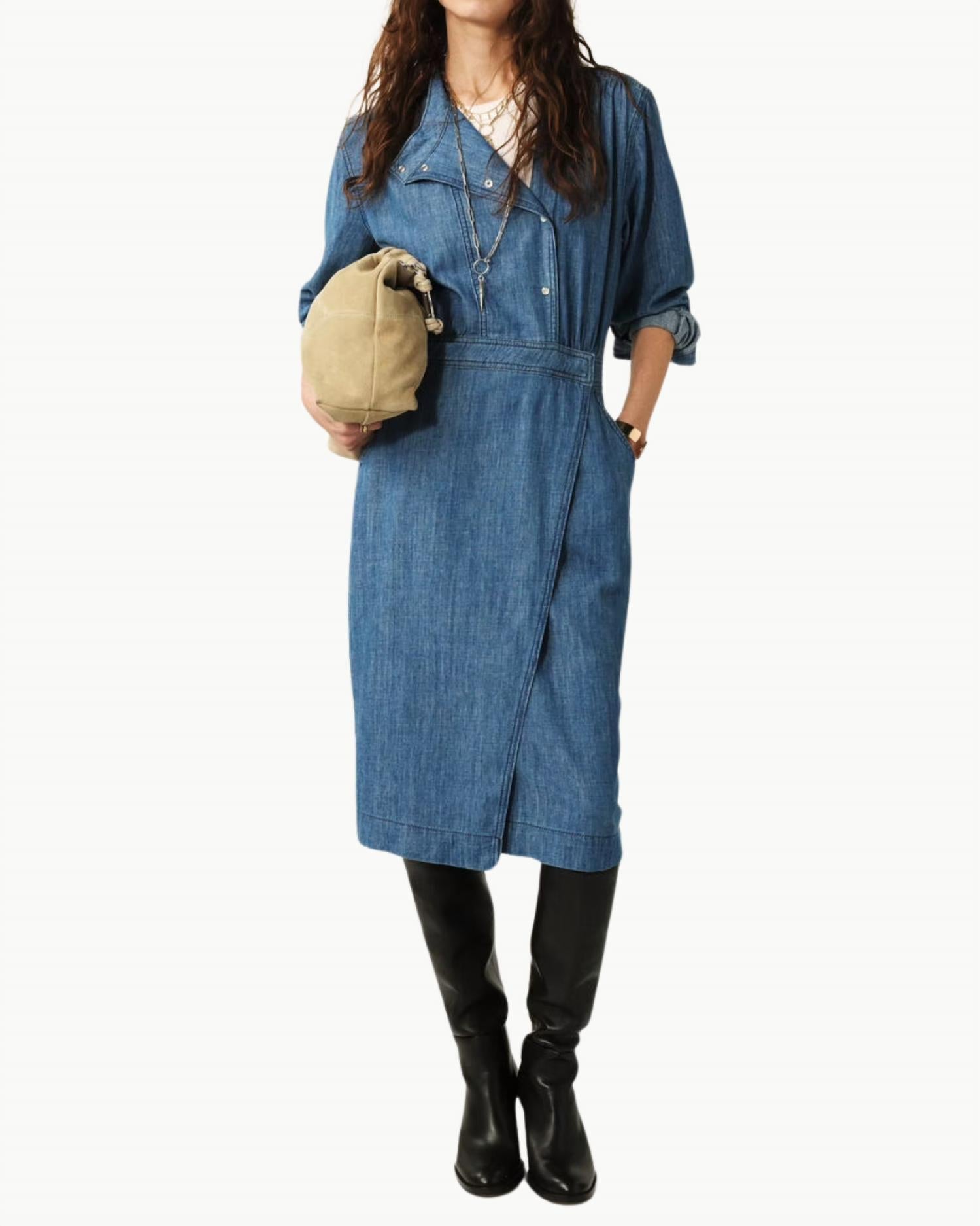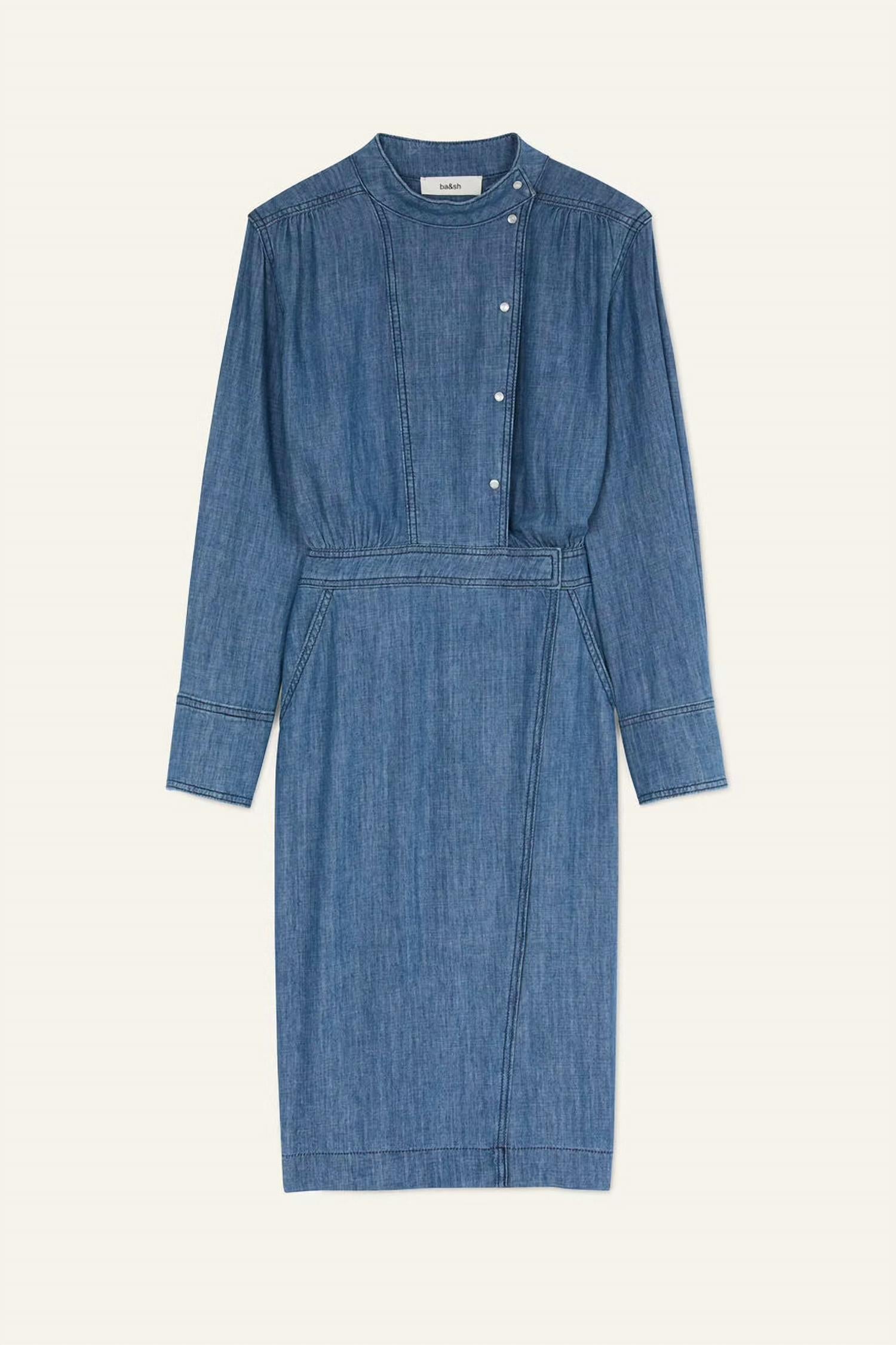 Just add slides or mules and you are good to go. Introducing the Wakie Denim Midi Dress by ba&sh, a light used blue piece blending comfort with chic sophistication. This dress features long sleeves and a blend of 60% Cotton, 20% Tencel, and 20% Linen, ensuring breathability and softness. Designed with an asymmetrical button placket and a snap button closure, it also boasts a stand-up collar for a touch of elegance. Perfect for travel, this solid-patterned dress with Italian side pockets and back patch pockets is machine washable for easy care, capturing the essence of 90s fashion for the fall season.