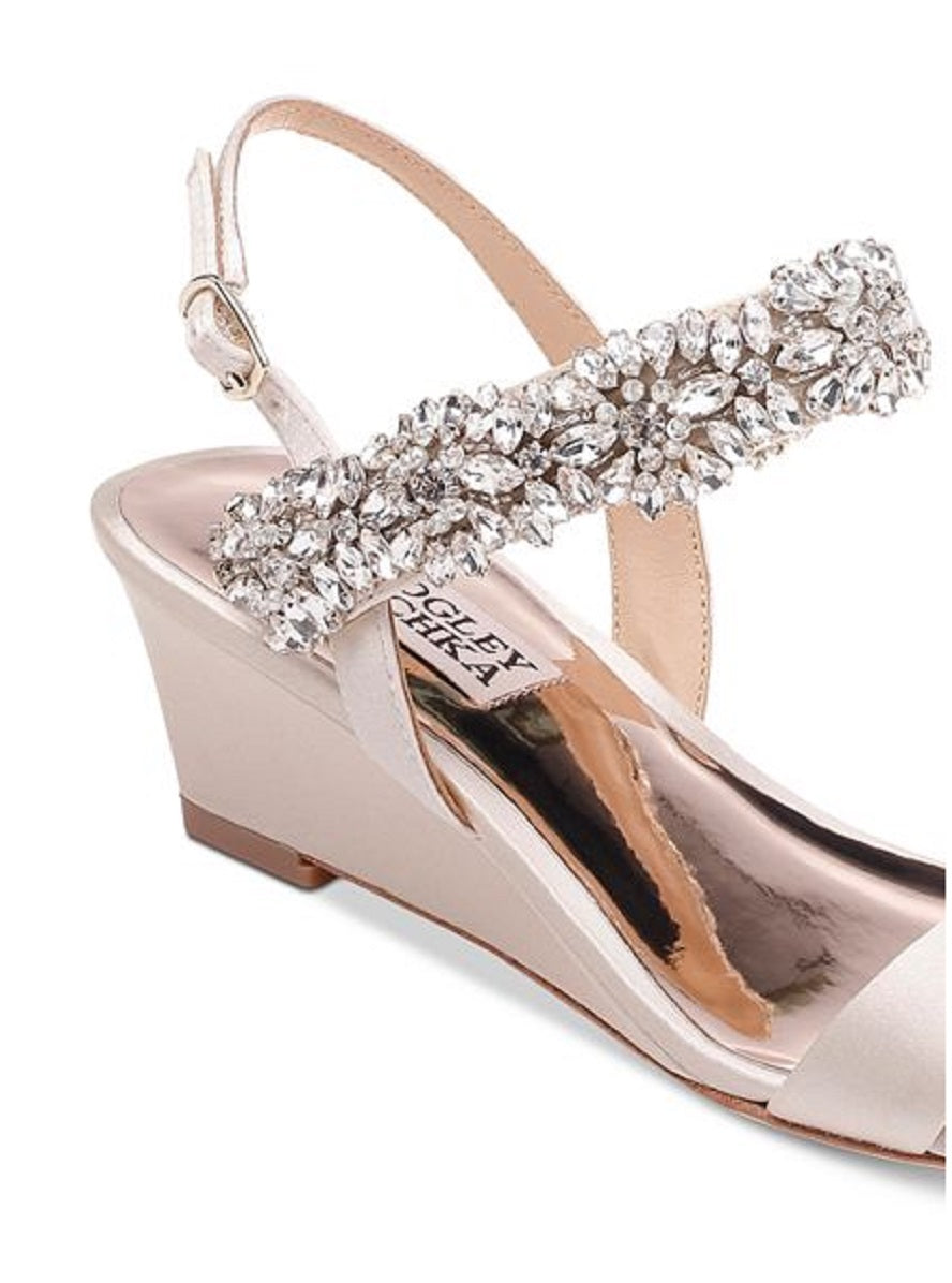 Badgley Mischka grounds the elegant Larisa evening sandals with a sleek wedge heel while rhinestone-encrusted straps lift the look to glamorous heights.| 1-3/4 wedge heel| Round-toe ankle-strap slingback wedge dress sandals with adjustable buckle closure| Rhinestone detailing at straps| Fabric upper; leather lining; leather sole| Imported
