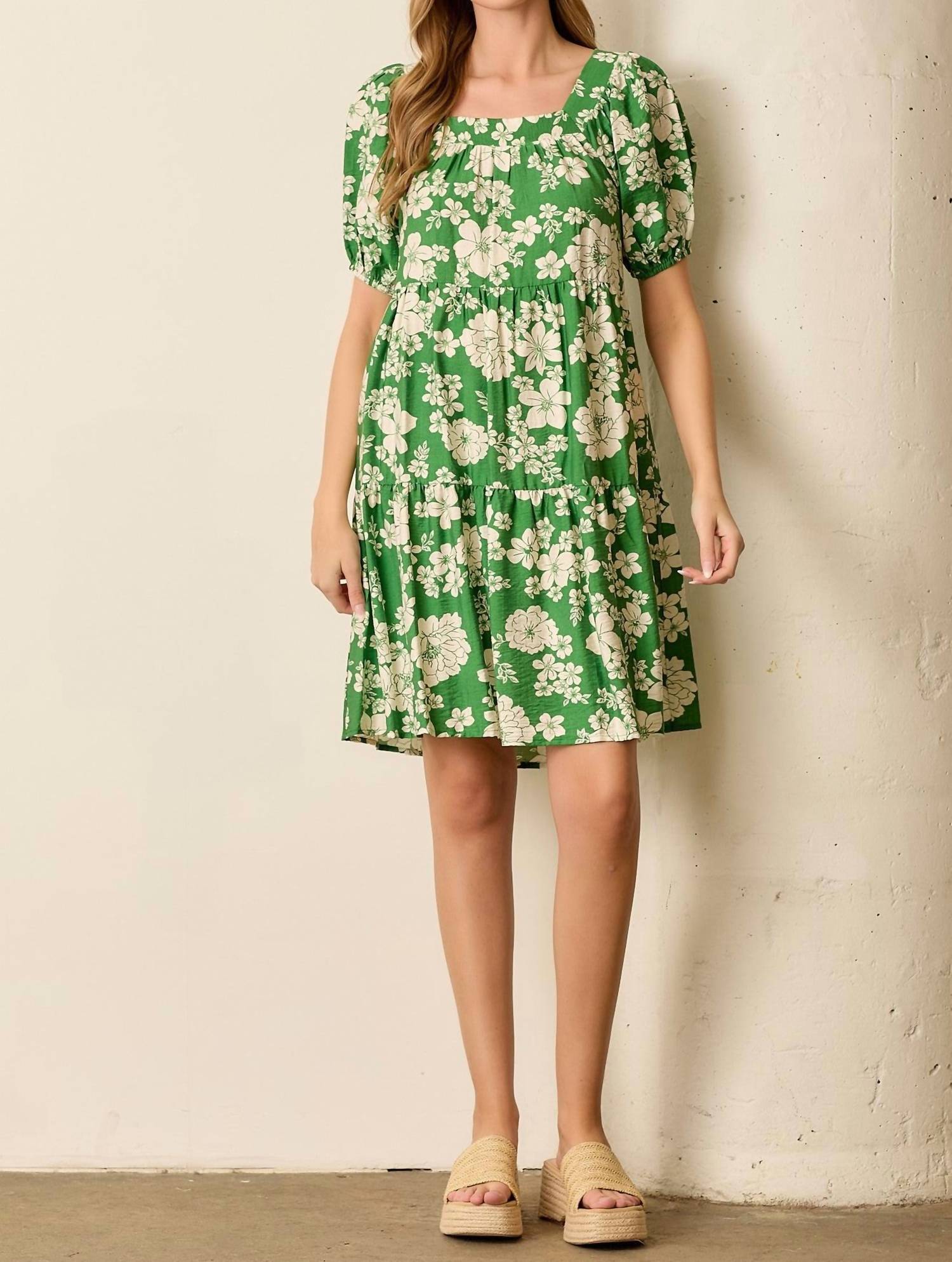 The kind of easy and flattering dress you'll be reaching for all season long. Step into summer with the Dolly Floral Print Balloon Sleeve Tiered Dress by Baevely by Wellmade, a captivating piece in a refreshing green and white floral pattern. Featuring playful short balloon sleeves, this knee-length shift dress showcases a stylish squareneck design and hidden side pockets for added convenience. The dress is crafted from a delightful mix of rayon and polyester, embodying the essence of boho chic perfect for holiday parties. Closure: Pull On.