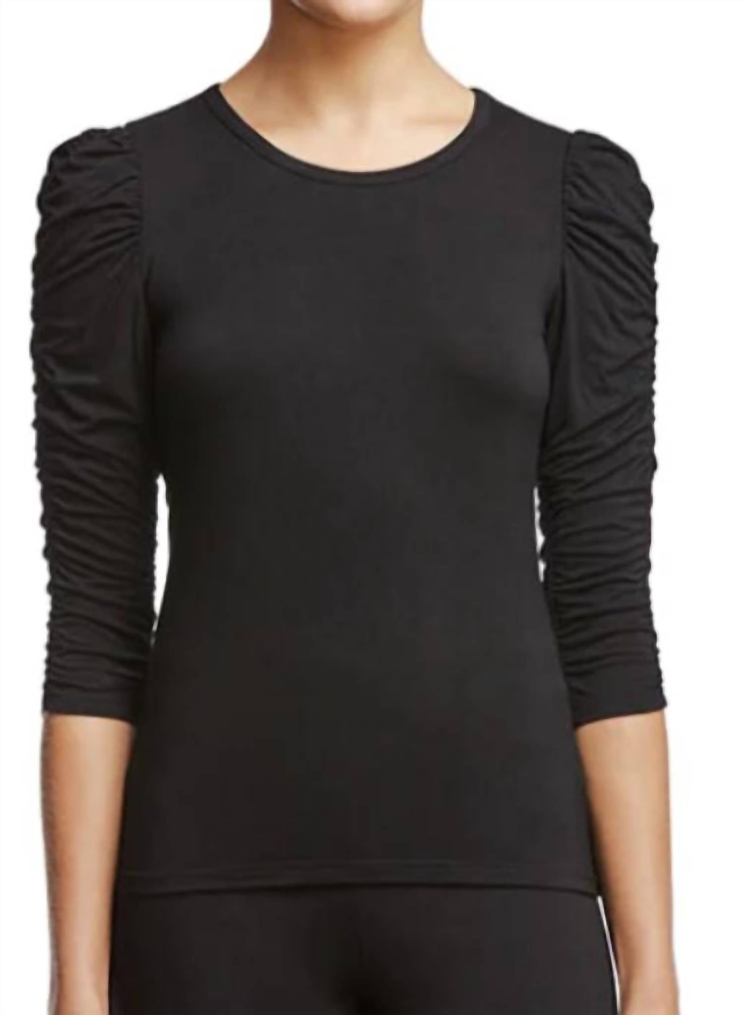 Great fit, cute design, soft fabric. You'll love everything about this long sleeve tee. Black 3/4 ruched sleeve shirt