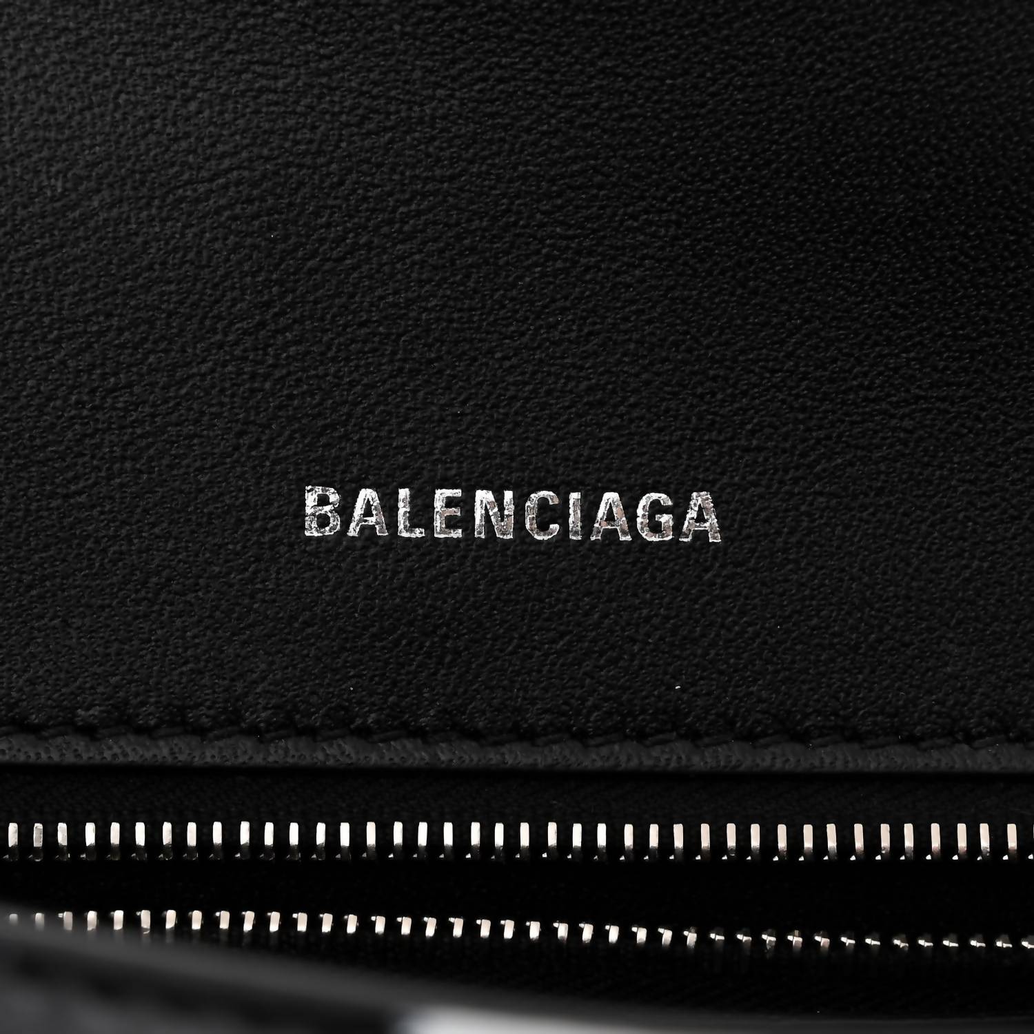 A casual and cute take on everyone's favorite crossbody bag. Introducing the Women's Polka Dot Spray Hourglass Handbag XS by BALENCIAGA, a timeless accessory for the fashion-forward. Expertly crafted from smooth calfskin leather, this stylish bag features a chic black and white polka dot pattern. With dimensions of 5.50" in height, 3.75" in width, and 9" in depth, it offers a top handle, an optional shoulder strap, and a signature Balenciaga B charm. The front flap reveals a luxurious black leather interior with a convenient zipper pocket.