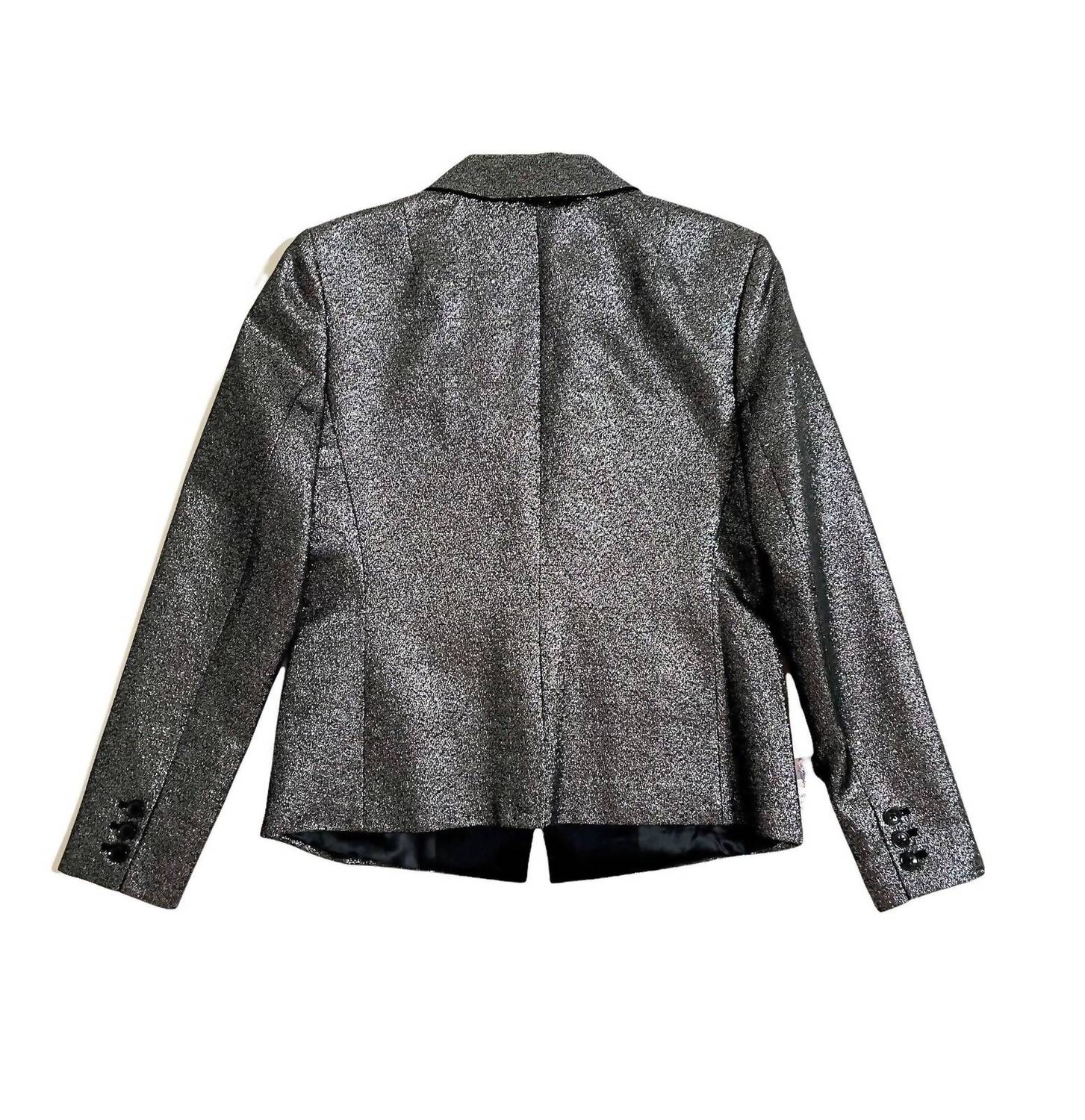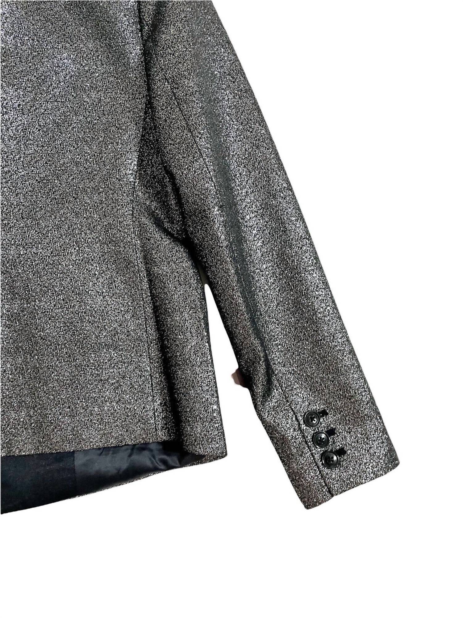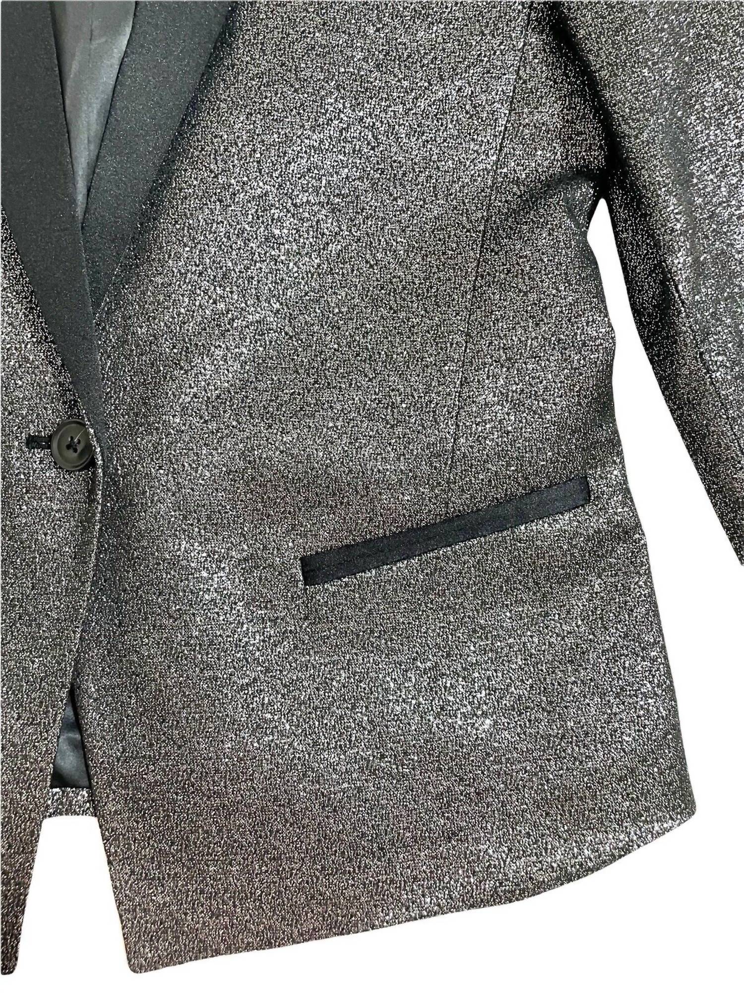 Elevate your evening attire with the Women's Evening Party Cocktail Blazer by Banana Republic, designed with glitz and glamour in mind. This long-sleeve jacket combines a glittery silver upper with a black satin collar and pocket trim for a touch of sophistication. Made from 46% rayon, 41% polyester, and 13% metallic fibers, it features a lining for added comfort. It measures 23" in length with a 14.5" shoulder and 17.5" chest and closes with a single button, completed by buttoned cuffs and practical slit pockets. Hand wash cold to maintain its shine.