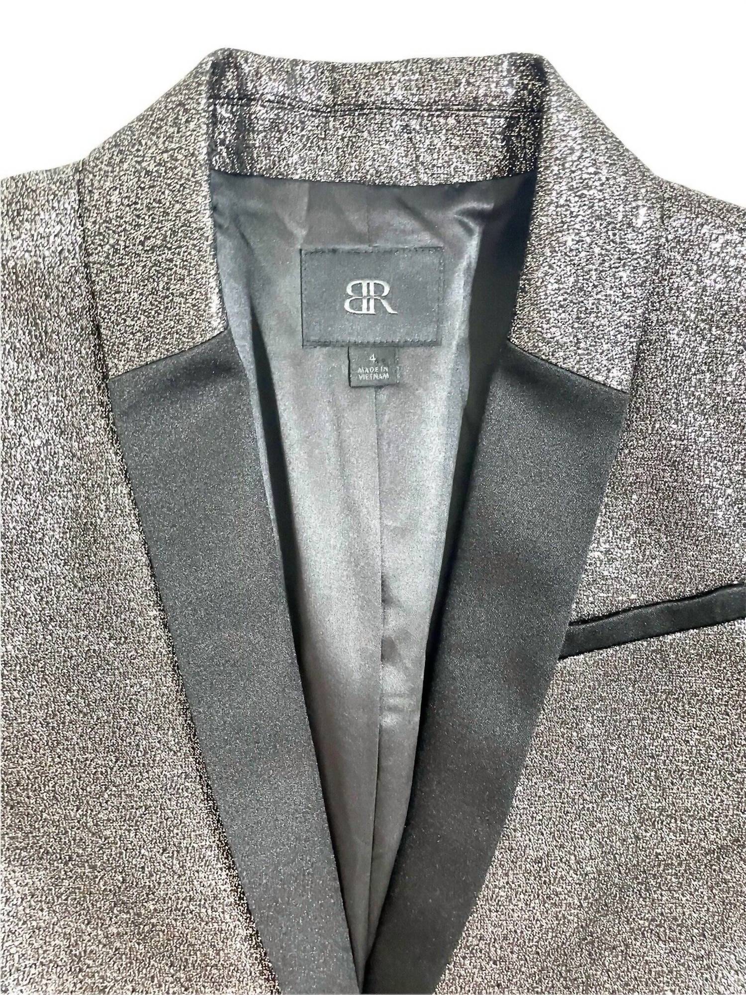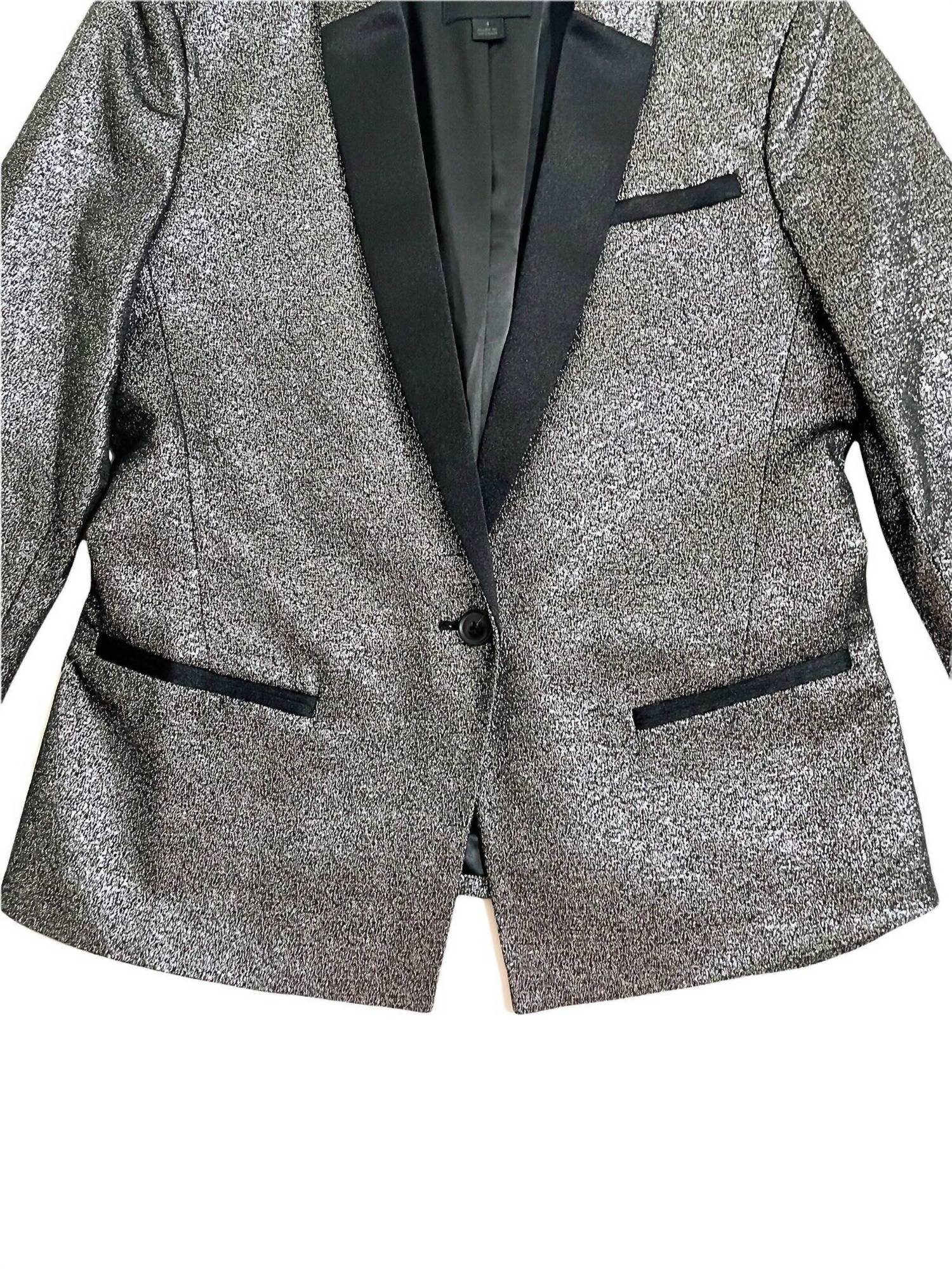 An elevated version of your favorite classic blazer. Elevate your evening attire with the Women's Evening Party Cocktail Blazer by Banana Republic, designed with glitz and glamour in mind. This long-sleeve jacket combines a glittery silver upper with a black satin collar and pocket trim for a touch of sophistication. Made from 46% rayon, 41% polyester, and 13% metallic fibers, it features a lining for added comfort. It measures 23" in length with a 14.5" shoulder and 17.5" chest and closes with a single button, completed by buttoned cuffs and practical slit pockets. Hand wash cold to maintain its shine.