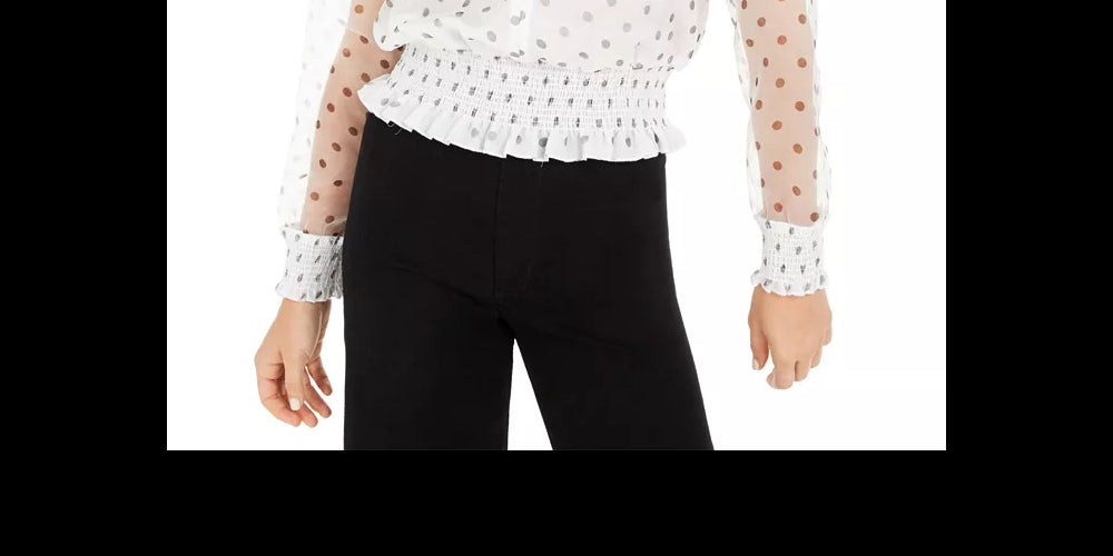Fitted; approx. 22-1/8" long|Round neckline; keyhole with button-and-loop closure at center front|Elastic smocked waistline|Long sheer blouson sleeves with smocked cuffs|Shell: polyester; lining: polyester
