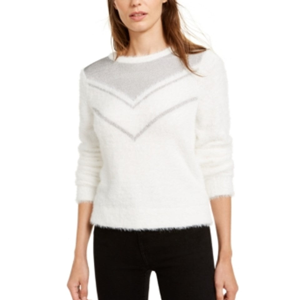 A fashionable fusion; fuzzy softness is fortified with chainmail-style metallic trim in this smart crewneck sweater from Bar Iii