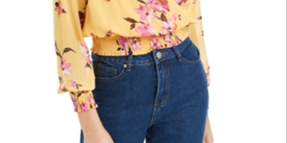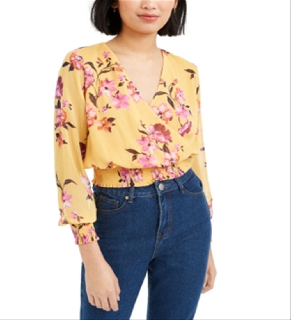 Bar III Women's Printed Smocked Blouse Yellow Size X-Large