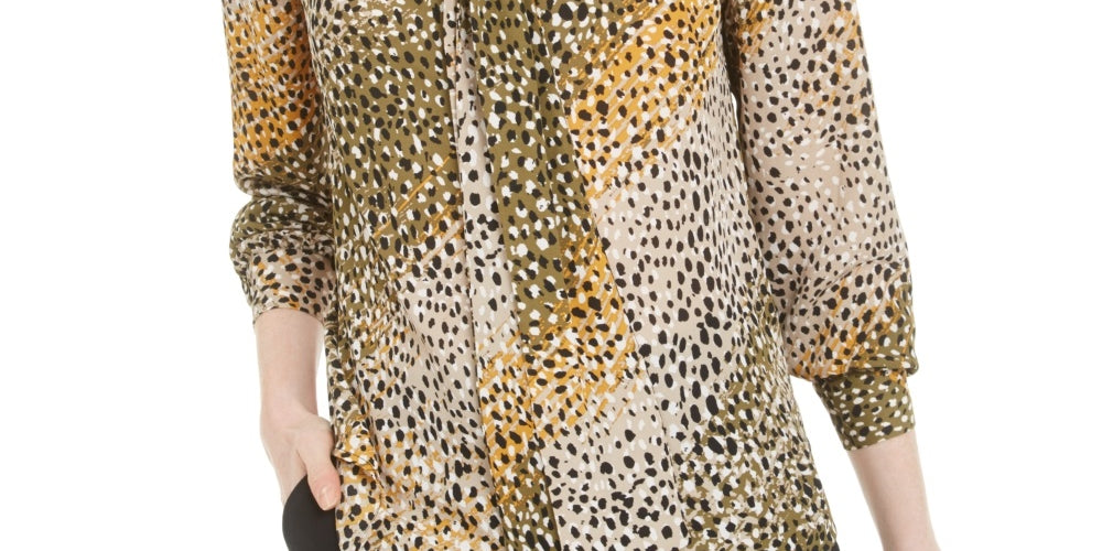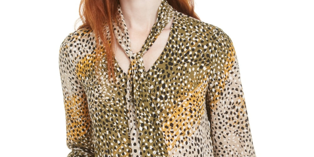 Bar III Women's Printed Tie Neck Top Green Size Small