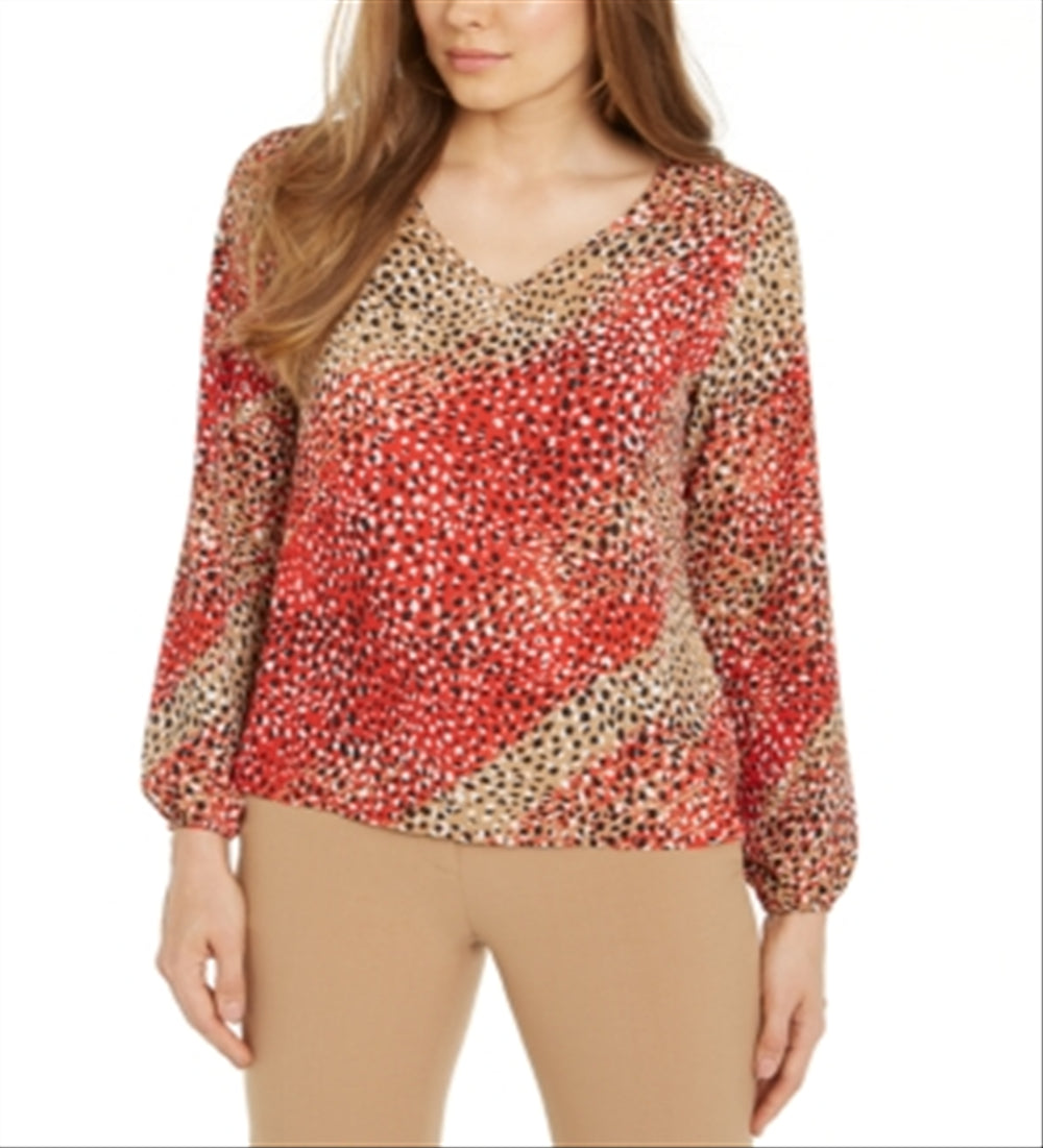 Bar III Women's Printed V-Neck Blouse Red Size S