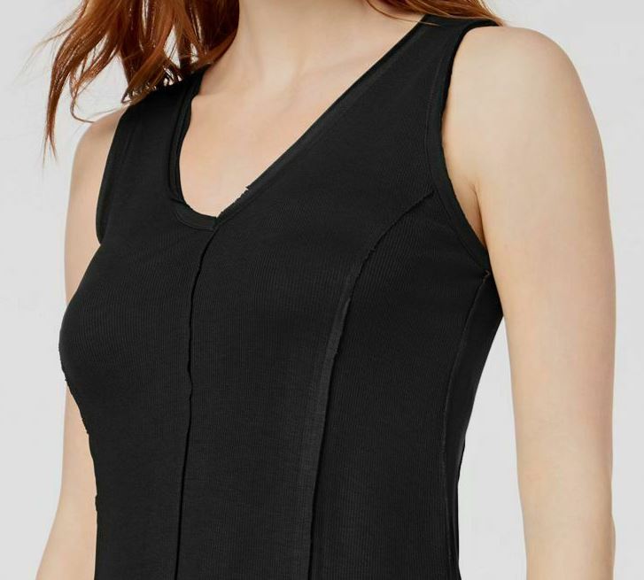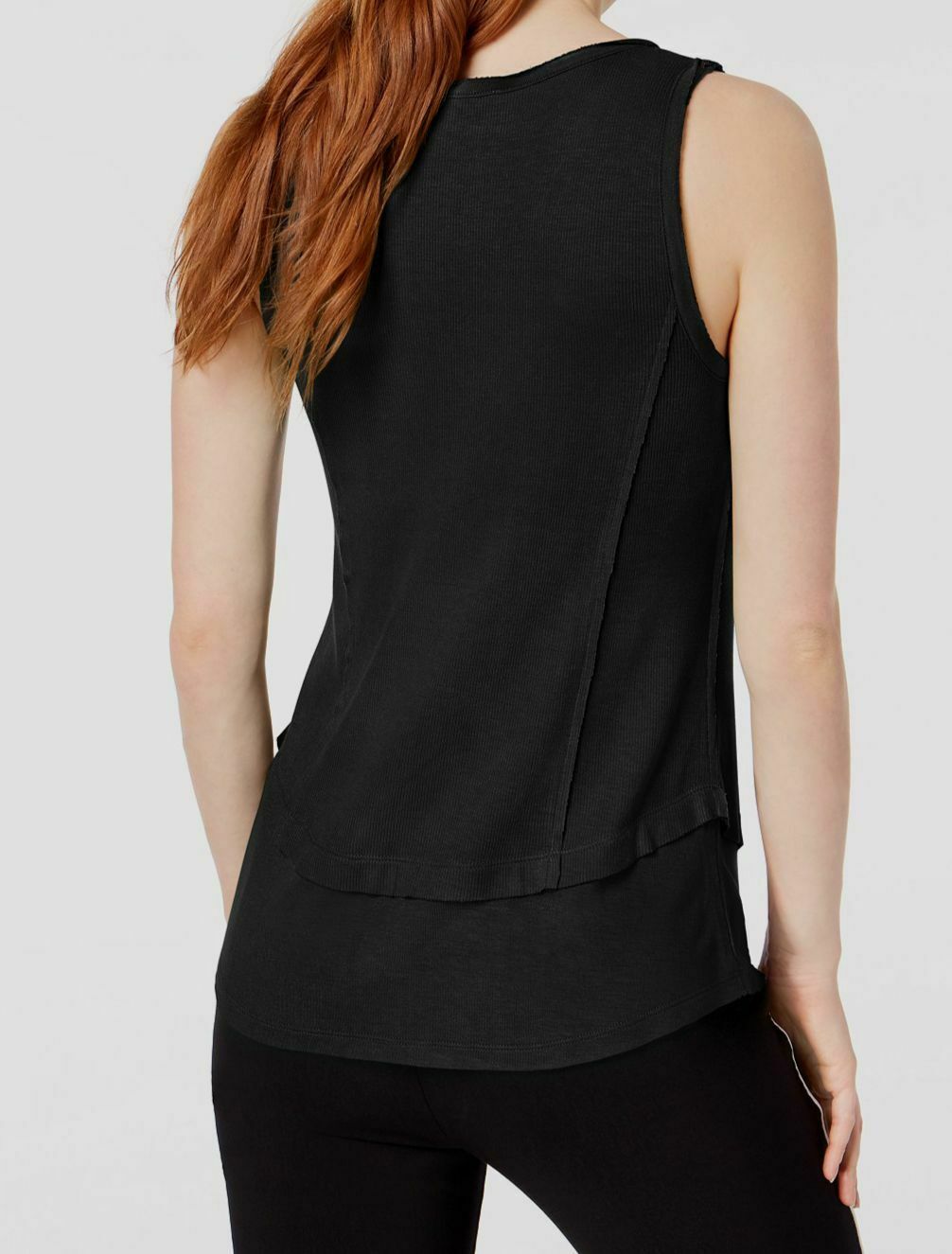 Hits at hip|V-neckline|Raw-edge details at neckline and bodice; layered-look hem|Body: rayon/spandex; trim: rayon|Machine washable|Imported