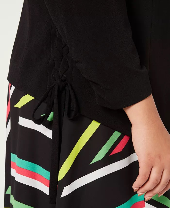 Approx. model height is 5'10" and she is wearing a size 1X|Approx. 21-1/2" long|Designed to fit and flatter 5'4" and under frame|Collarless; open front|Lace-up detail at sides|Scrunched 3/4-sleeves with shoulder pads