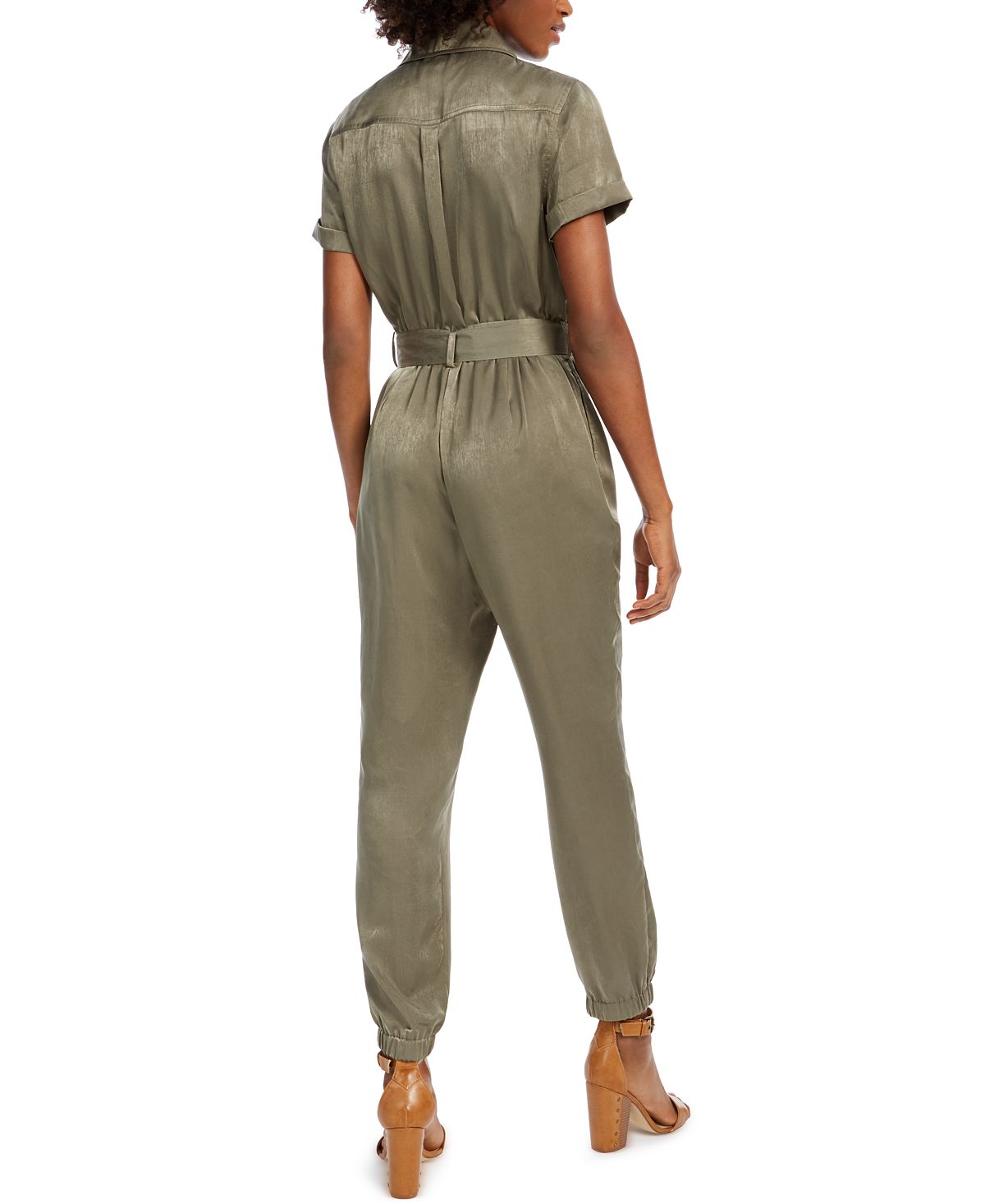 Turn every head in this hot utility jumpsuit from Bar III| featuring a flattering belted waist and a flightsuit-inspired O-ring front zipper.| Approx. inseam; 29| Front rise; approx. 10-3/4; back rise; approx. 16-3/4| V-neck; zipper closure at front with O-ring metal hardware detail| Sash belt included