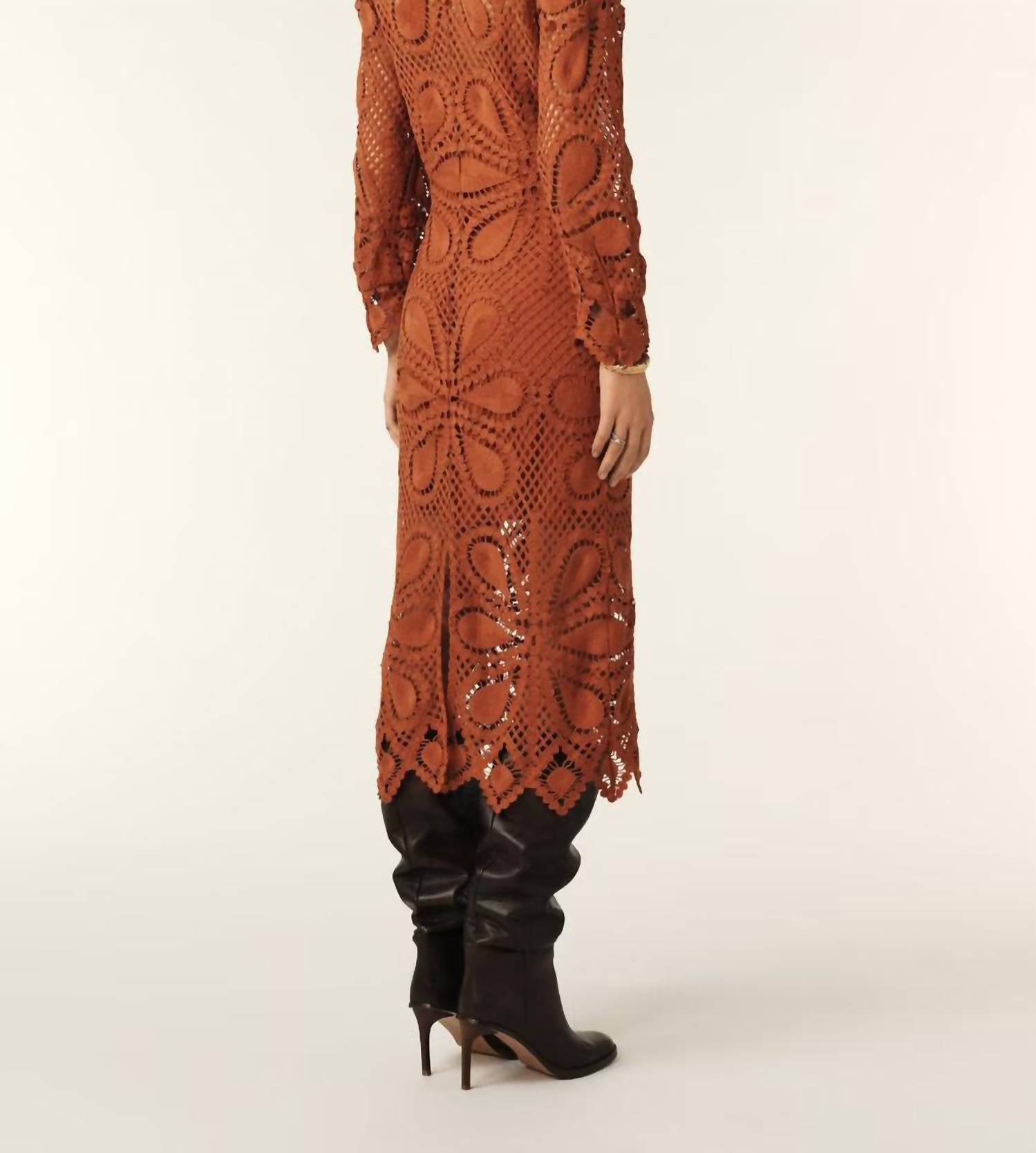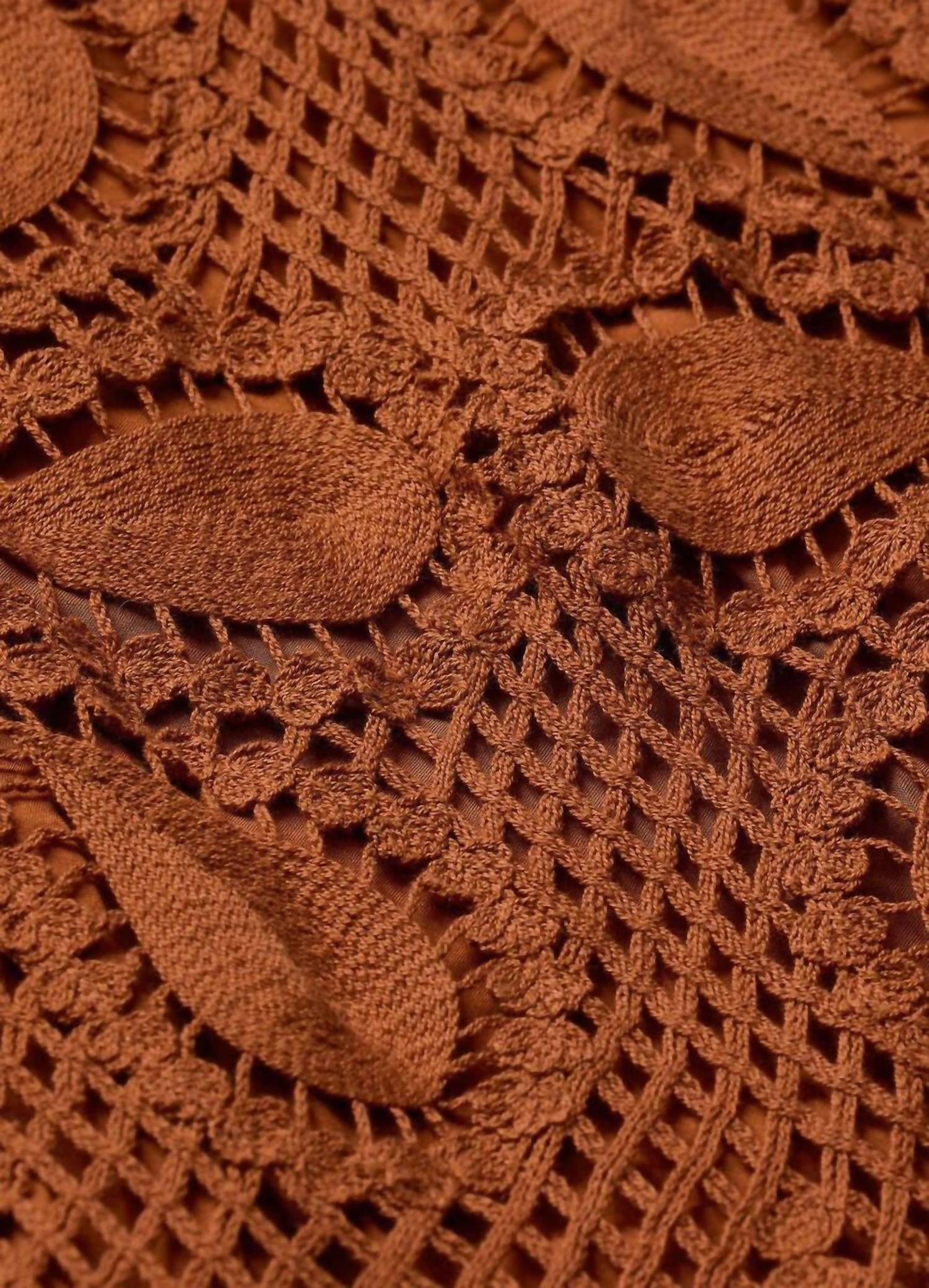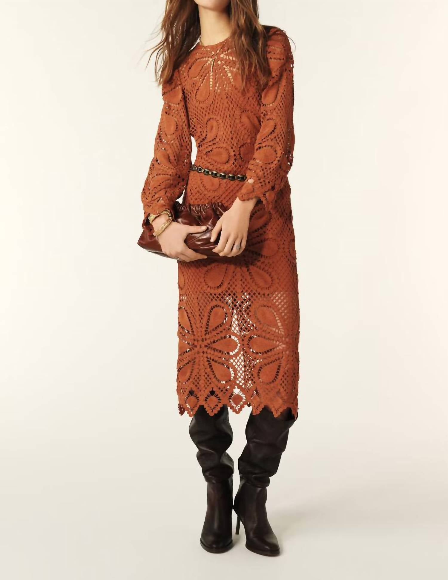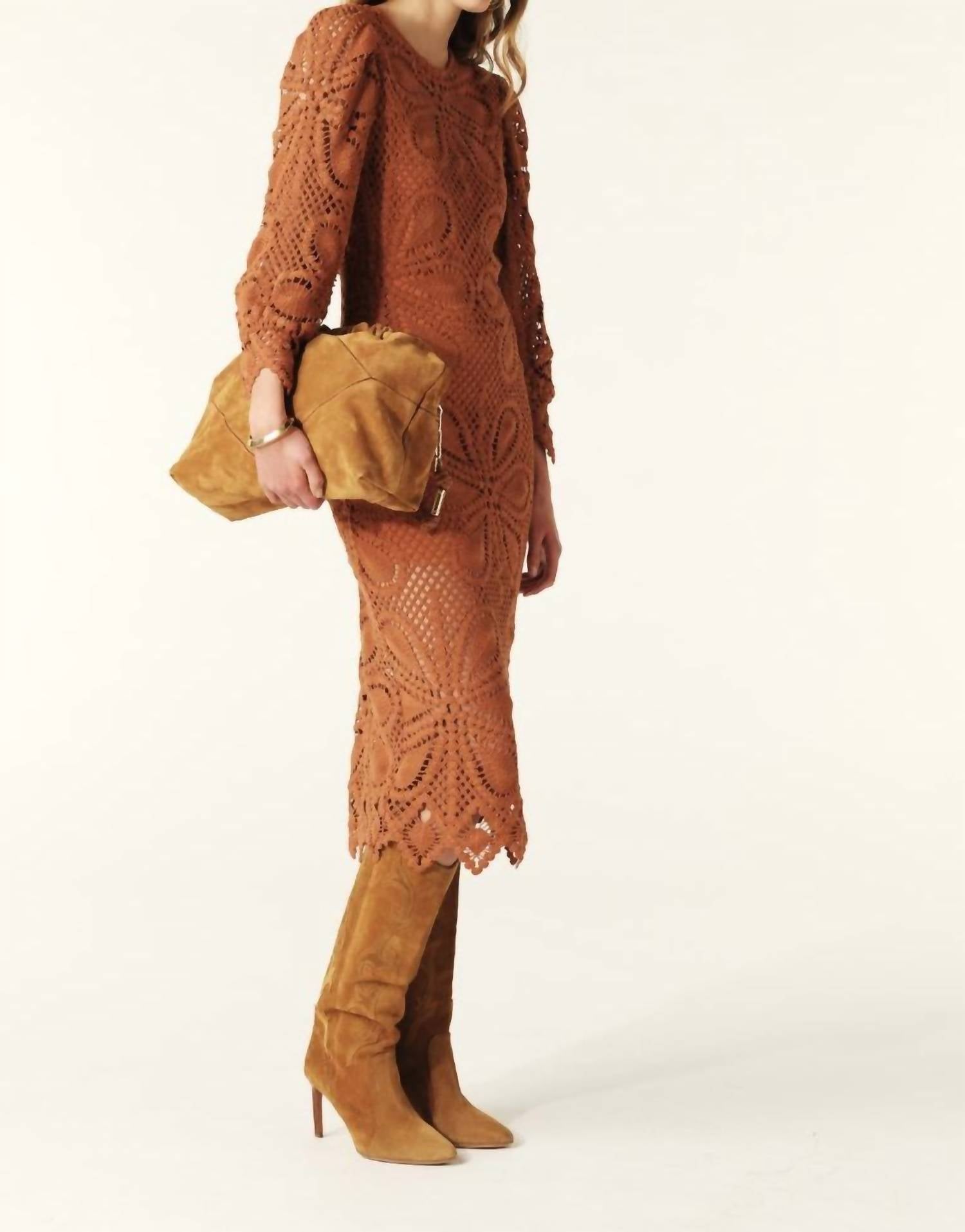 Experience the effortless elegance of the Grace Midi Dress by Bash, a stunning choice in praline for any evening event. This boho chic piece features long sleeves and is crafted from cotton, offering both warmth and style with its A-line silhouette and crochet sweater design. Garment length is calf-length, ensuring a sophisticated appearance. Closure: Pull on. Care instructions: Machine wash, tumble dry.