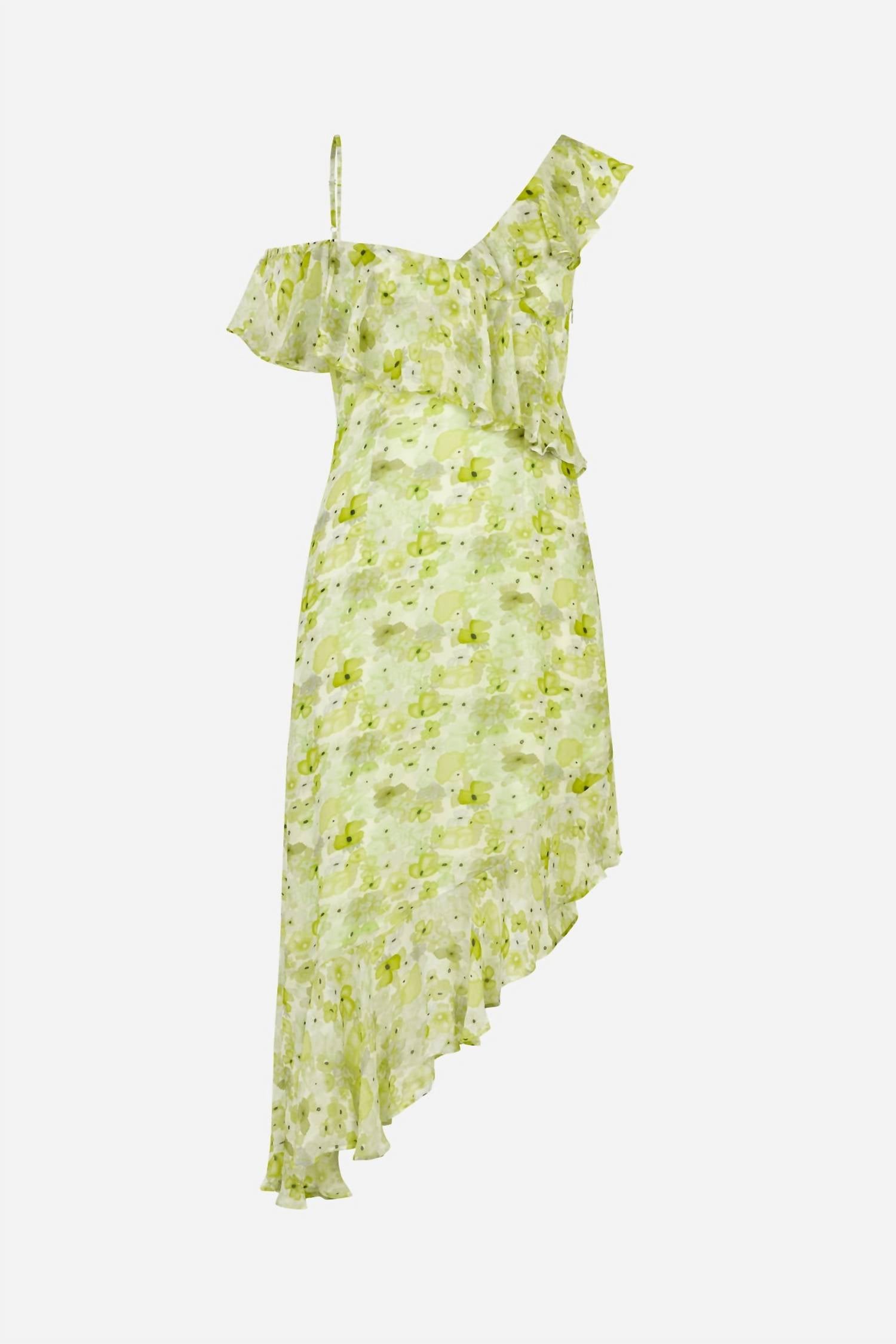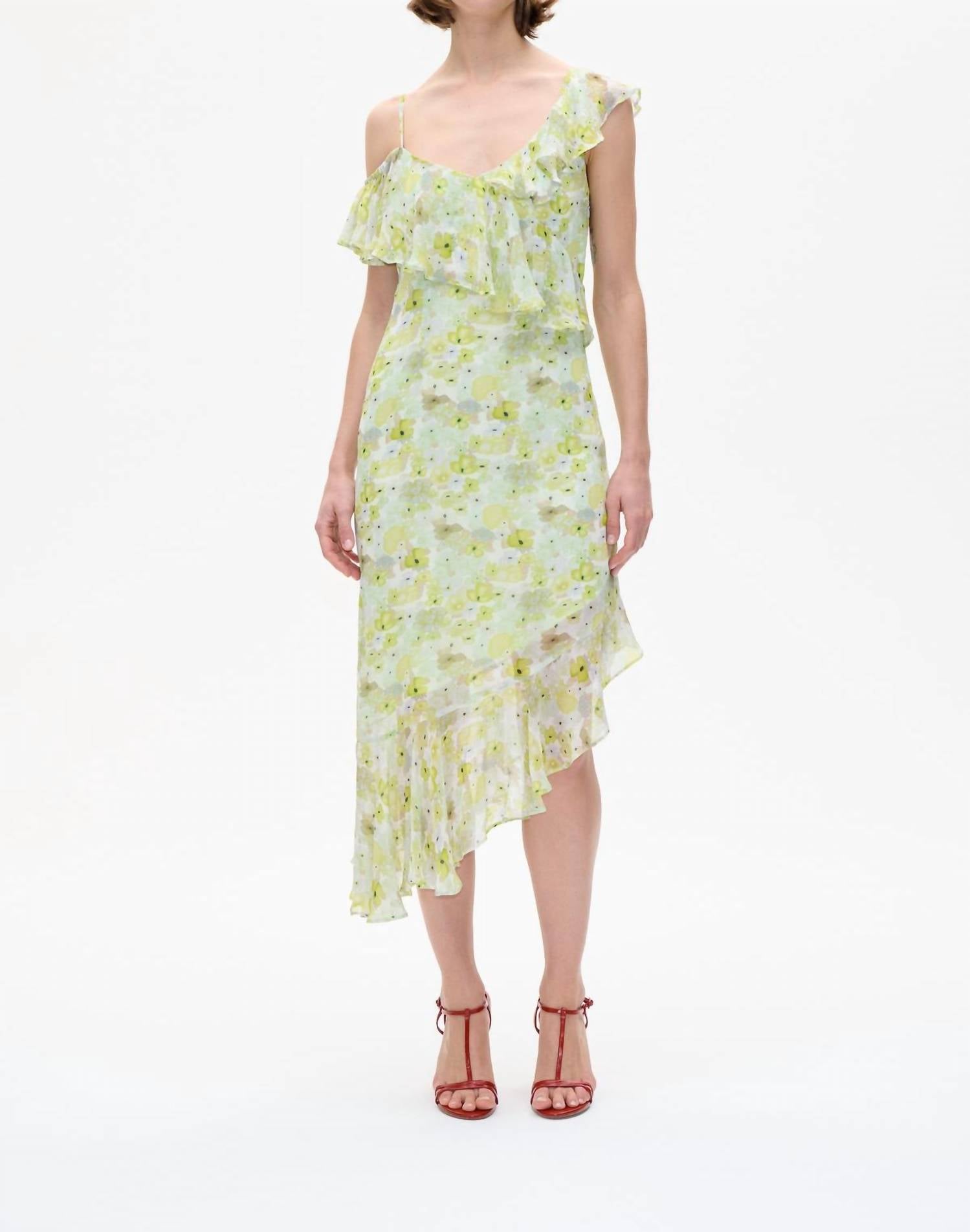 Introducing the Avah Dress by BAUM UND PFERDGARTEN, a chic choice for your summer holiday party collection in a vibrant Sunny Lime Flower floral pattern. This sleeveless, off-the-shoulder dress offers a relaxed fit with an airy midi length, highlighted by ruffles across the chest and hem. Crafted expertly with a main fabric of 100% Viscose and a lining of 98% Viscose and 2% Elasthane, it features an adjustable strap and a convenient side zip closure. Care for this A-line silhouette with professional dry cleaning only, using a mild process, to maintain its Boho Chic appeal.
