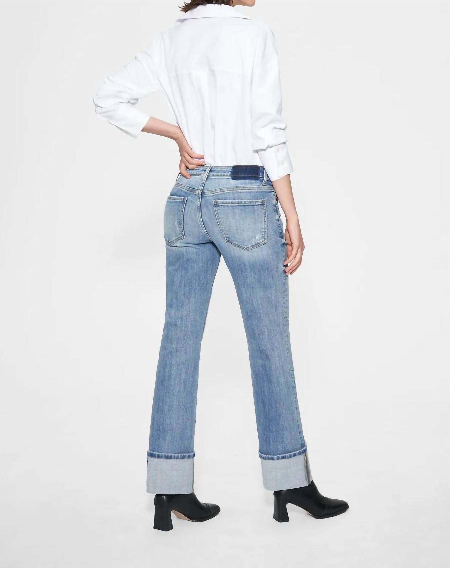 This classic straight leg jean has a perfect fit and goes with just about everything. Experience the effortless style of the Flora Cuffed Straight Leg jeans by Bayeas, perfect for any fall occasion. These women's jeans are crafted from a high-stretch cotton blend, featuring a mid-rise and a classic five-pocket design in a textured light wash blue. The straight leg style is accentuated by a cuffed ankle and distressed hems, with a unique double stitching and raw-edge finish at the waistband. Care instructions are simple: machine wash and tumble dry.