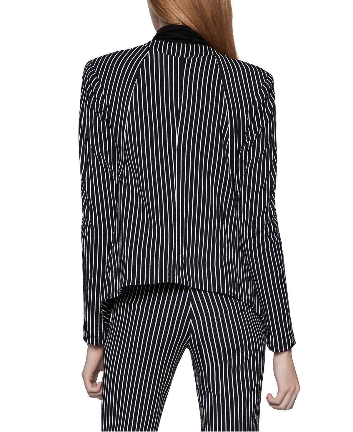 Talk about a power suit. This BCBGeneration blazer is perfectly tailored for a slim fit| with an open front and asymmetric hem. Cut from a subtly pleated velvet| this piece instantly ups your jacket game.| Long sleeves with shoulder pads| Lined| Open front| Allover pleated
