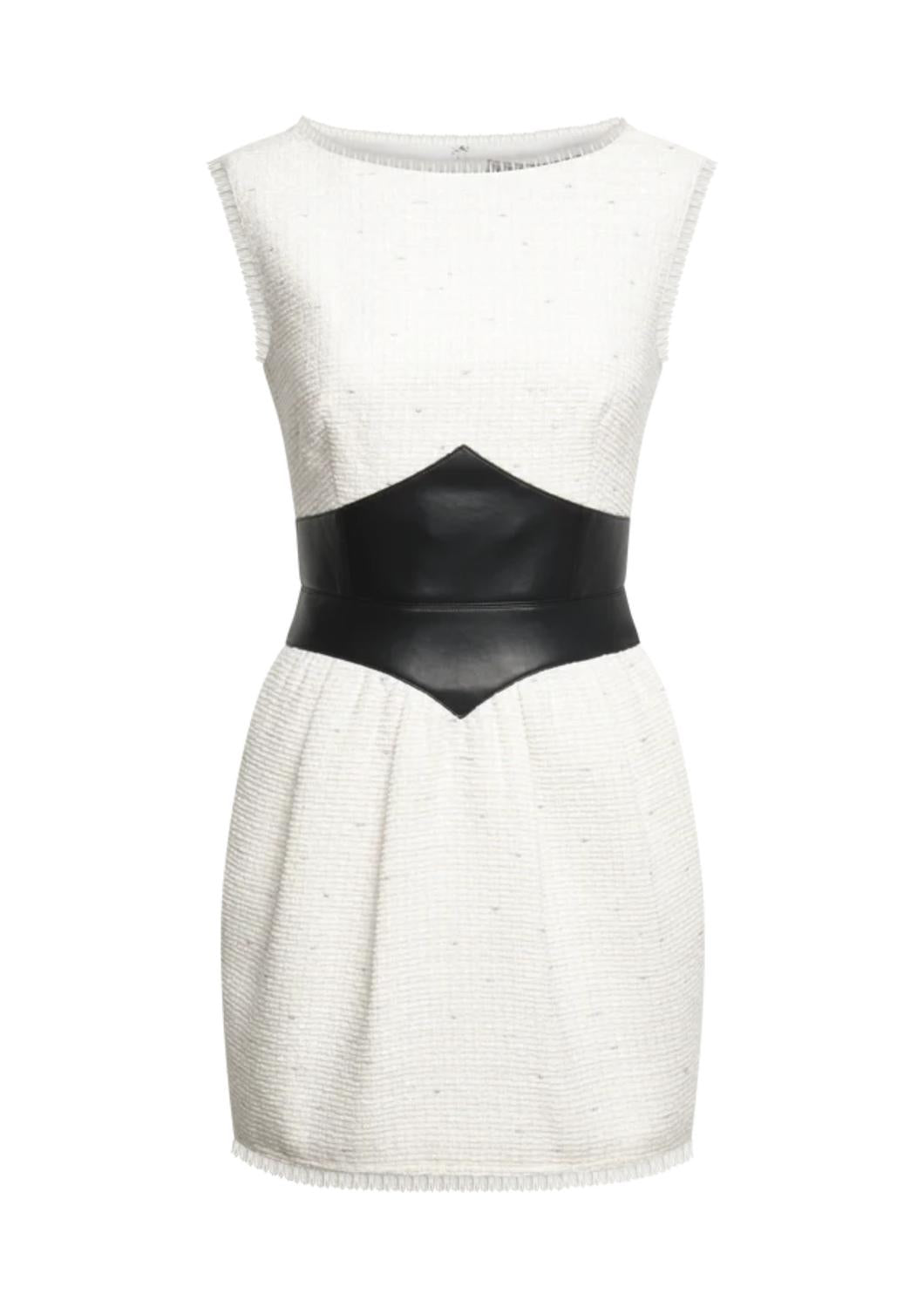 The Leather Tweed Dress by BCBGMAXAZRIA is a stunning sleeveless mini dress crafted from luxurious tweed and adorned with sequins and eyelash fringe. It features a faux leather waist inset creating a sculpted, corset-like silhouette, complemented by a sleek zip closure at the back. This dress is fully lined and stretches to a length of 34.25 inches from the shoulder. Imported and ideal for cocktail parties, it requires professional spot cleaning only. Model wears a size 4 (32" bust, 24" waist, 34" hips).