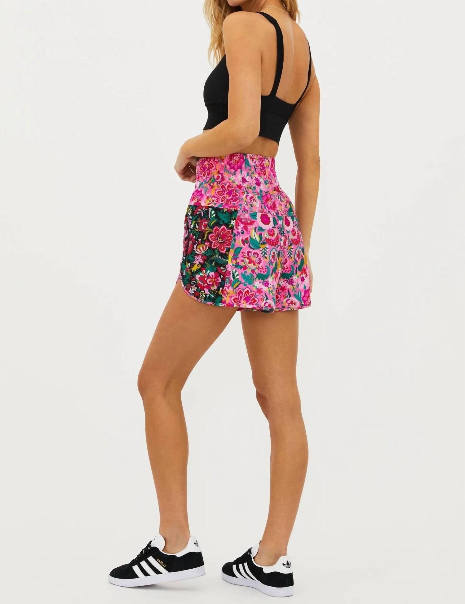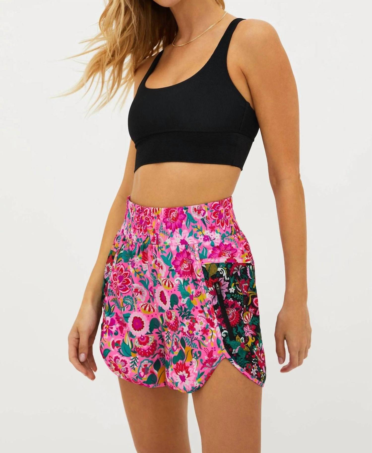 Fit to perfection, we love these high-waist shorts and you will too. Introducing the Cliff Short by Beach Riot in the vibrant Passion Flor print, designed for those who embrace a maximalist style. These lightweight running shorts feature an 8.5" inseam, with a wide elasticated waistband and a convenient side zip pocket. Composition: 90% Polyester, 10% Spandex. Closure: Pull on. Care: Hand wash or machine wash gently in cool water, avoid fabric softener, never dry clean or iron. Model is wearing a size small. Perfectly suited for a spring fitness routine or workout.