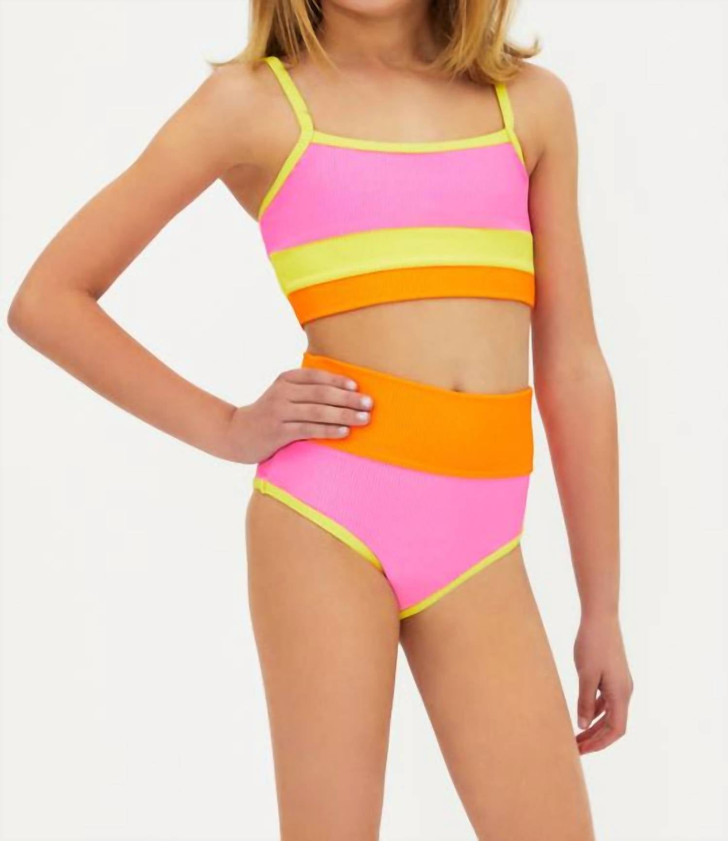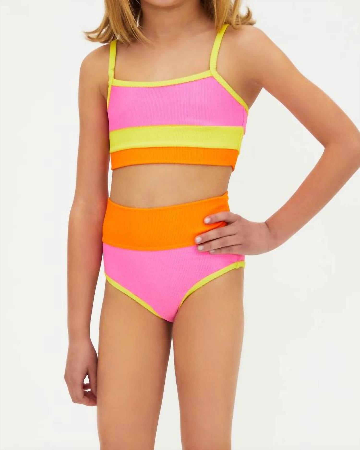 Unveil vibrant summer vibes with the Soleil Colorblock Tween Little Eva & Emmy Bikini Set by Beach Riot, an exciting addition to your girl's swimwear collection. Composed of 82% Polyester and 18% Spandex, this Y2K-inspired bikini features a stylish stripe pattern and high-waisted design, complete with ribbed fabric and adjustable straps for a perfect fit. Ideal for a fun beach day, it embodies the lively energy of the season. Care instructions: Hand wash cold.