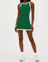 Introducing the Zephyra Tennis Dress by Beach Riot in a vibrant Racquet Court Green, crafted for on and off the court style. This sleeveless mini dress features a solid pattern and a high neckline with a bodycon silhouette, complemented by a cut-out back detail. Made from Matte Core fabric composed of 70% Nylon and 30% Lycra, it offers moisture-wicking properties, fixed straps, and a shelf bra with removable pads for support. Closure: Pull on. Care: Machine wash, tumble dry. Perfect for athleisure looks and game day performance.