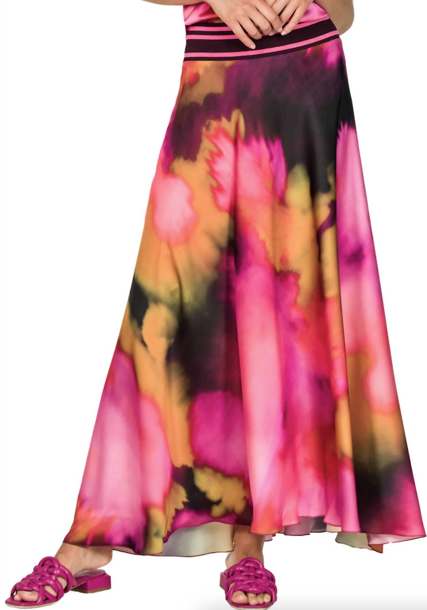 Who doesn't love a good maxi skirt? This satin abstract Skirt is an iconic style from Beate Heymann. Always popular and effortless for day or night, available in a stunning watercolor abstract print in shades of pink and green. Pull on with a contrast banded waist detail makes it a no brainer. Ankle length is perfect with boots or heels. Bias cut satin. 100%Poly