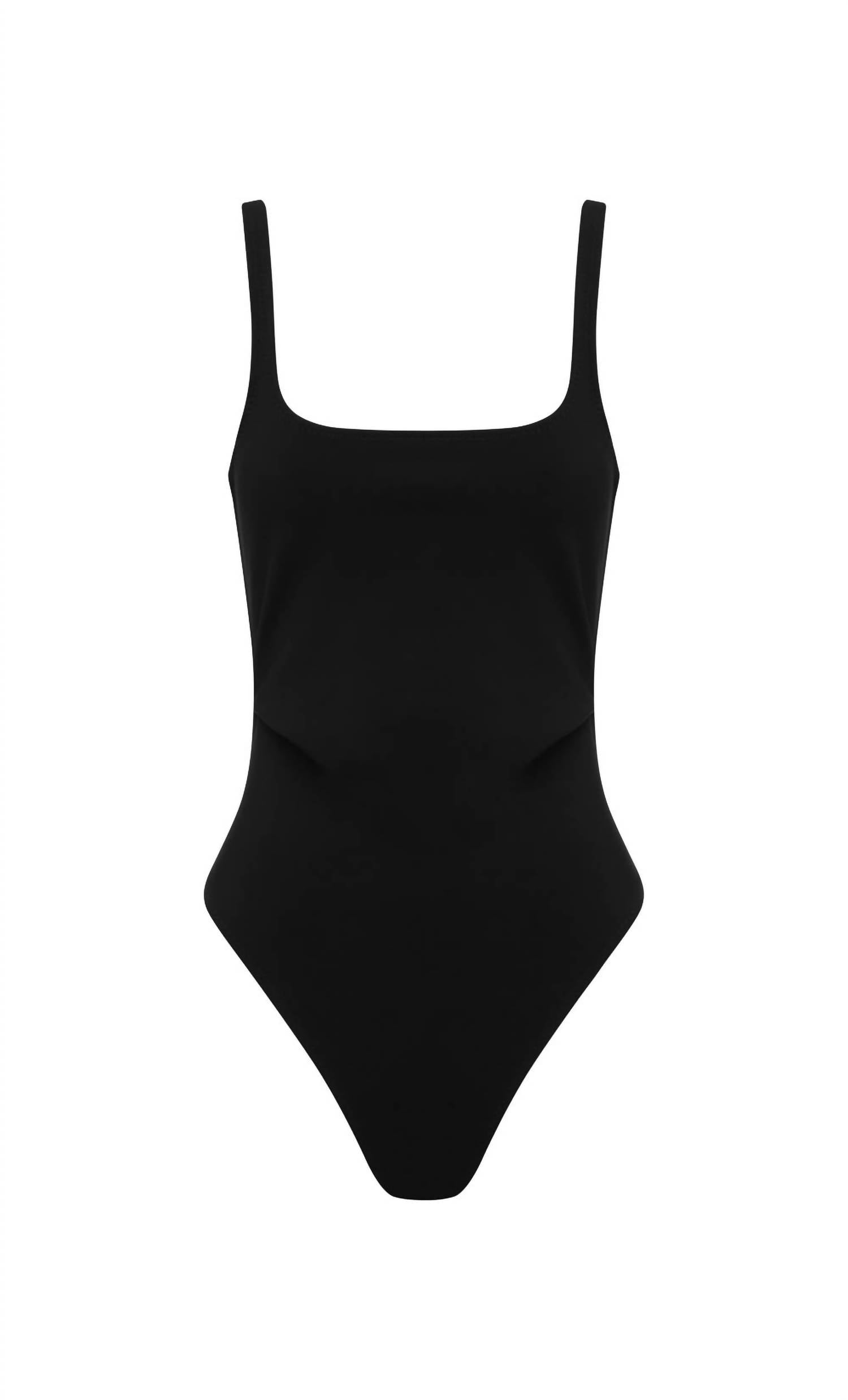 Elevate your swimwear collection with the Aluna Tuck One Piece Swimsuit by BEC + BRIDGE, designed for a timeless, vintage-inspired look. This solid black one-piece features a straight neckline with shoulder straps and a chic open back. Made from stretch knit fabric, it offers a classic hip-grazing cheeky cut for flattering coverage. Proudly designed and made in Australia, this piece fits true to size.