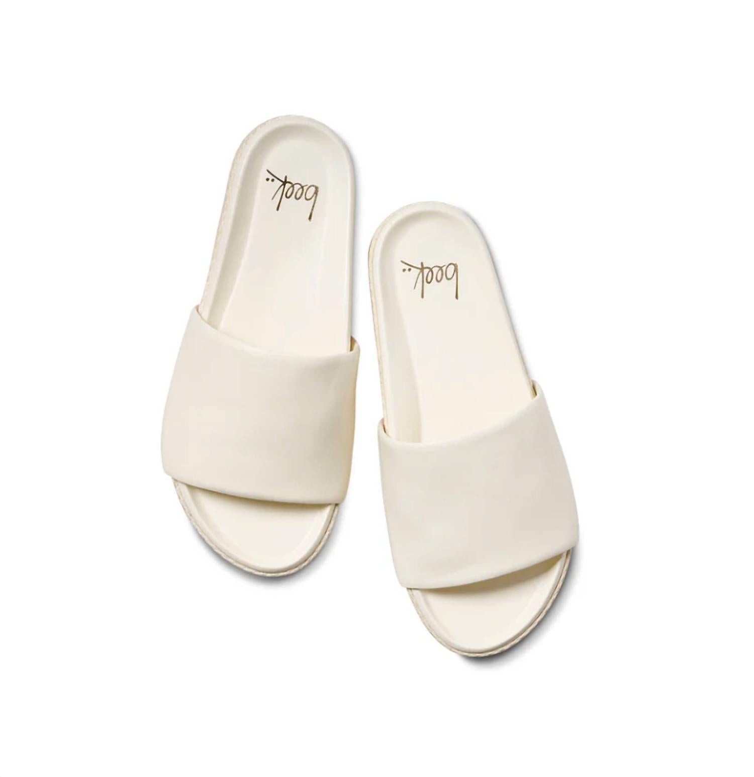 Flowy dresses, cropped pants, and even jumpsuits... this sandal works with them all! Experience the Women's Pelican Textile Leather Platform Sandal by beek, a perfect blend of style and comfort in a minimalist vanilla hue. Crafted with a 100% leather upper, this sandal is designed with a durable rubber outsole, ensuring all-surface grip. Its round toe and flat heel make it ideal for vacations and summer holidays. Enjoy all-day comfort with a signature memory foam footbed wrapped in soft leather, complemented by an artful textile platform wrap. Sustainability is emphasized with vegetable-tanned leathers and recycled materials.