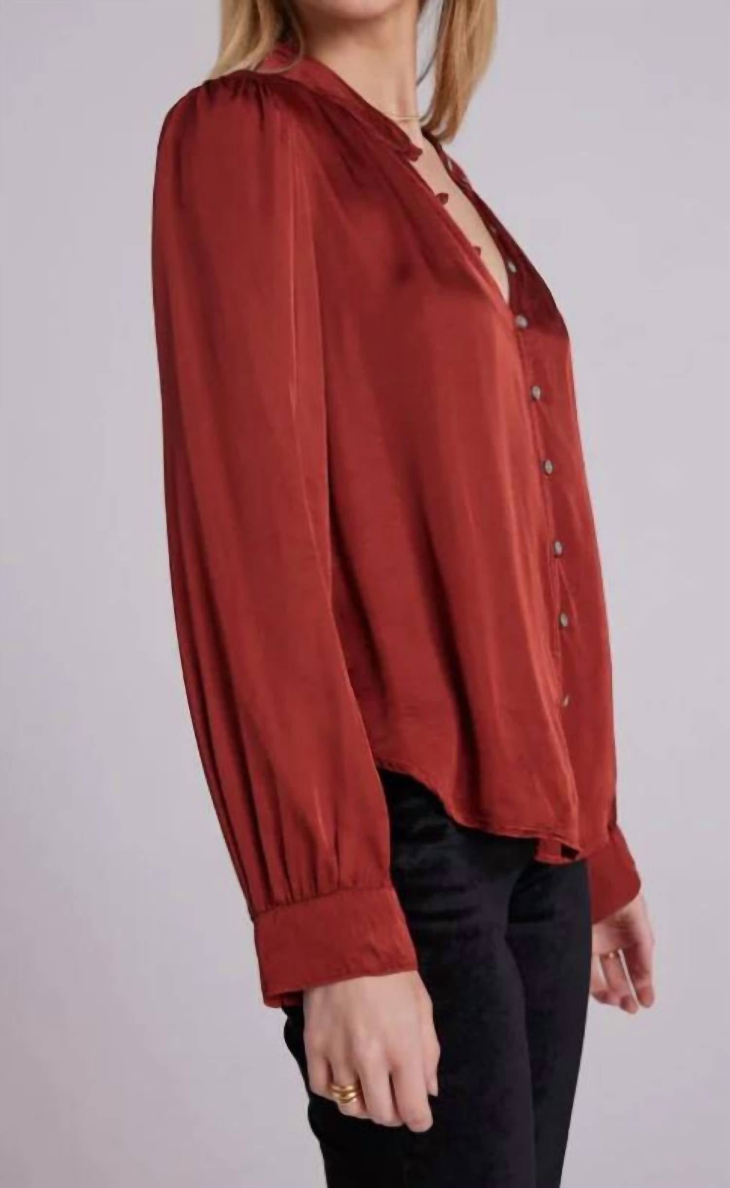 A versatile blouse that works from desk to dinner! A timeless addition to any wardrobe. With its classic button-up design, this blouse exudes sophistication and style. The buttons down the front not only enhance the blouse's aesthetic appeal but also provide functionality, allowing for easy wear. This satin button-up blouse is a must-have for fashion-forward individuals who appreciate both comfort and elegance. Long sleeve with button cuff Button down V neckline Shirred shoulder detailing 55% viscose 45% Rayon Machine wash cold