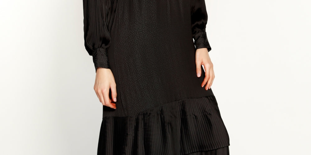 Walk the glimmering city scape at night in this breathtakingly romantic dotted charmeuse dress with pleated blouson sleeves| pleated ruffle hem| plunging neckline and tie front.| Approximately - 44.5 long| Runs true to size| order your normal size