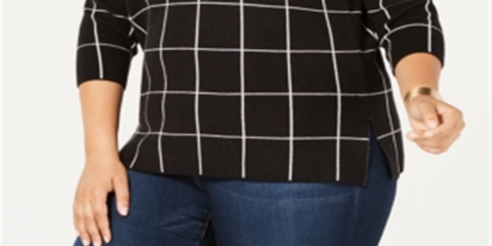 update your casual look with this plus size cowl-neck sweater from belldini| the striking plaid print delivers on style while the side vents bring comfort
