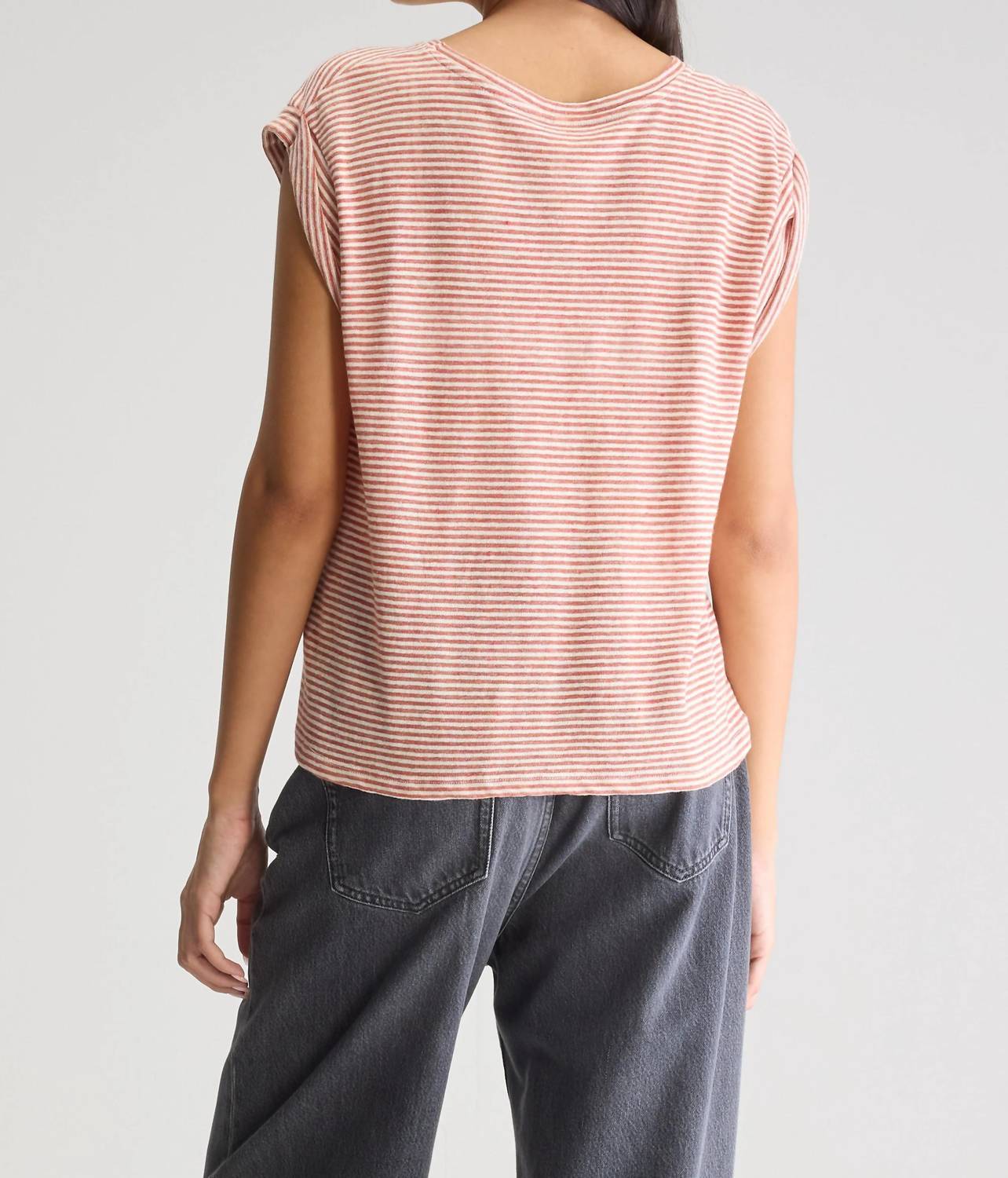 Streetwear staple in vibrant Pimento. Cap sleeve tee features a stylish red and white stripe pattern. Crafted from a blend of 50% cotton and 50% linen for lightweight comfort. Designed with folded shoulders and slanted side seams, offers a regular fit that is perfect for layering or wearing alone.