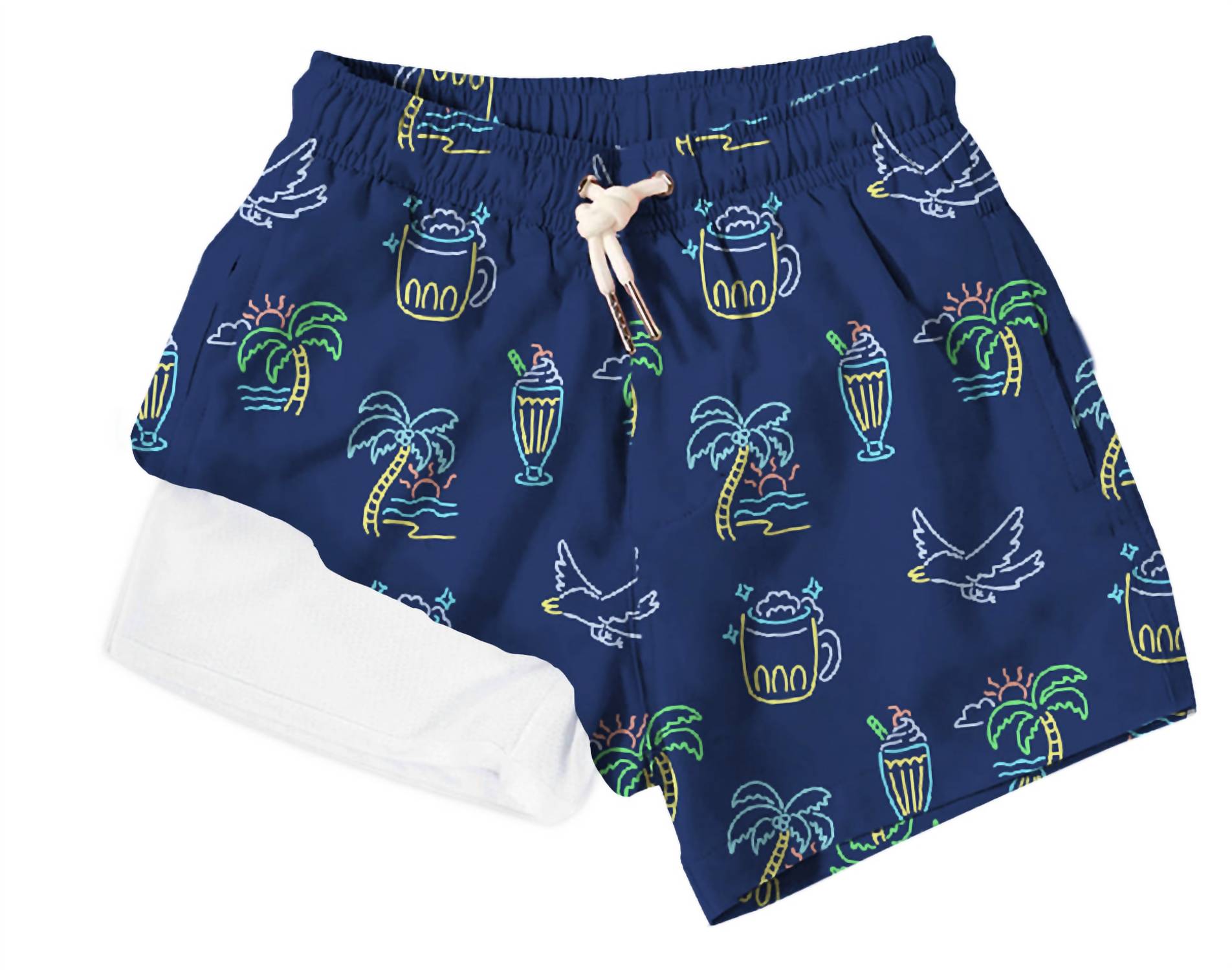 Dive into summer with the Boy's Lined Bermies Swim Trunks by Bermies, crafted in the vibrant Copacabana color. These swim trunks feature a full coverage style with a graphic pattern perfect for beach days. Composition: 90% Recycled Polyester, 10% Spandex. Ideal for swimming and beyond, these trunks promise both durability and comfort. Care instructions are not provided.