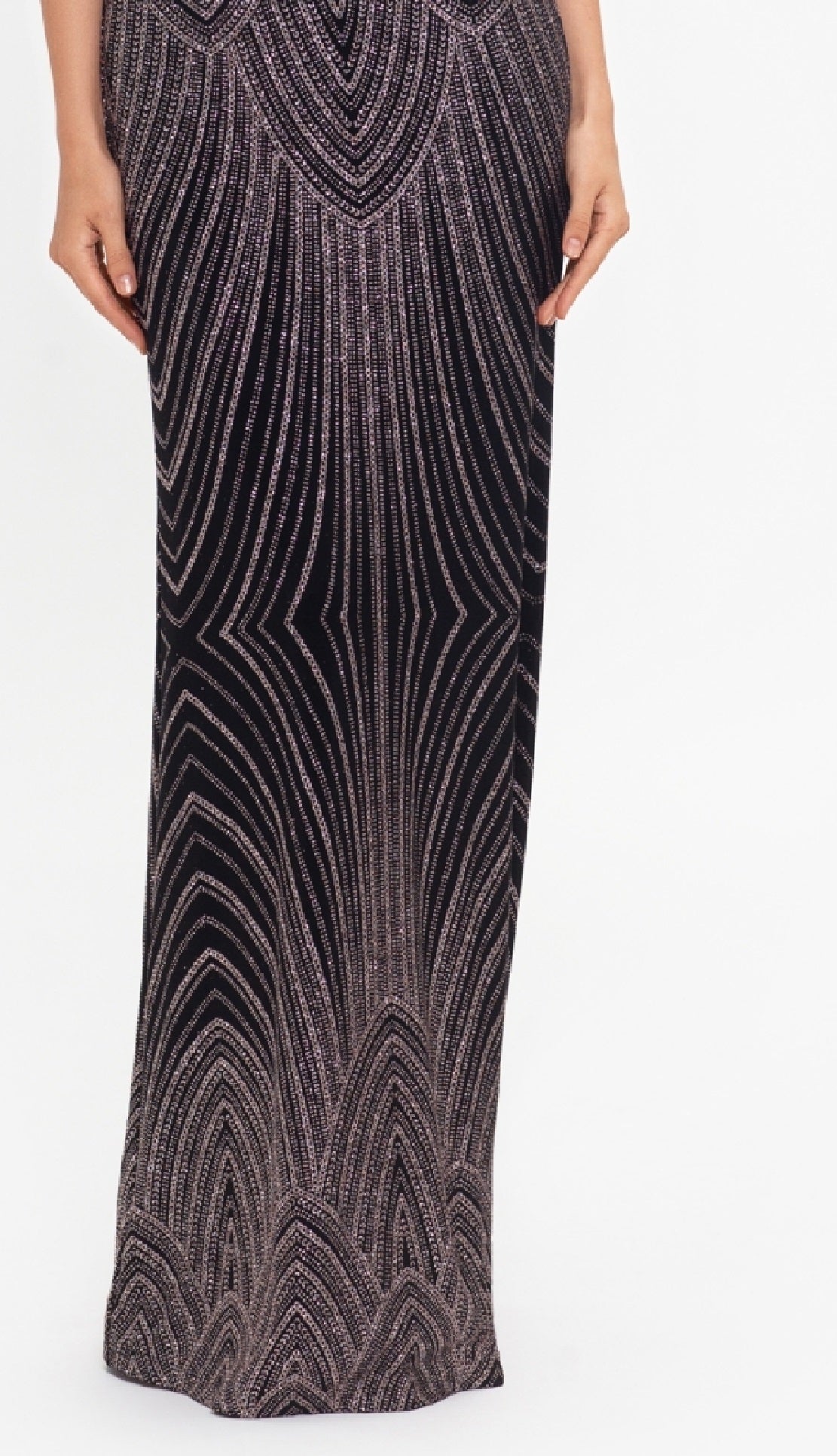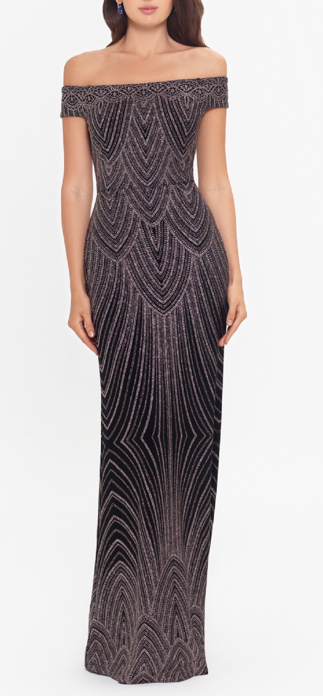 Off-the-shoulder neckline; Gown silhouette|Glitter may shed during wear|Floor-length formal dress|Imported|Back zipper closure|Allover intricately patterned glitter print|Connect with a stylist & get free expert advice online or in stores for your wardrobe