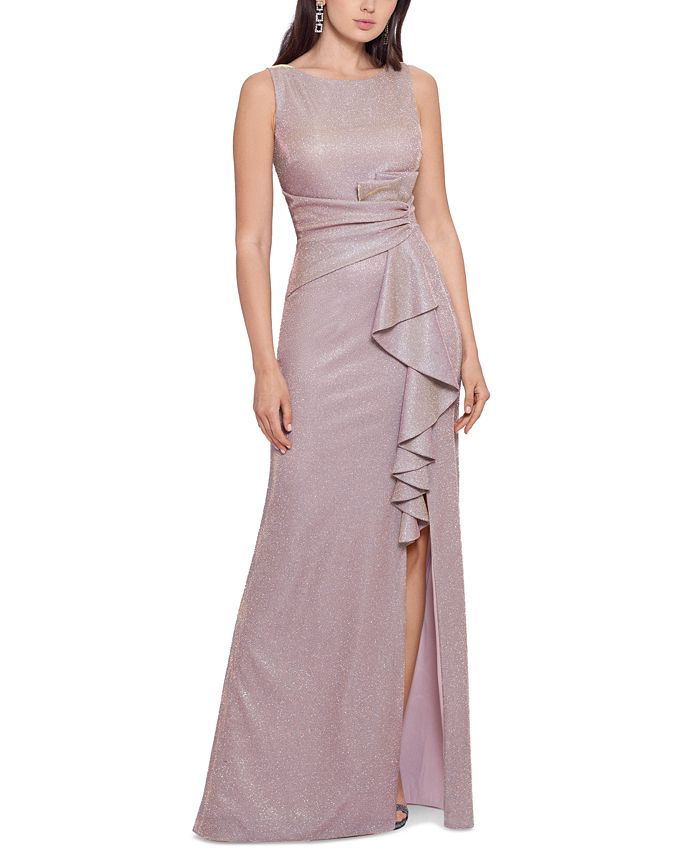 Glitter sparkles from every angle in this sleeveless gown from Betsy & Adam| a beauty fashioned with a ruffled front and thigh-high slit.| Back zipper closure| Ruffled at front with slit at hem| Glitter may shed during wear| Floor-length formal dress| Boat neckline