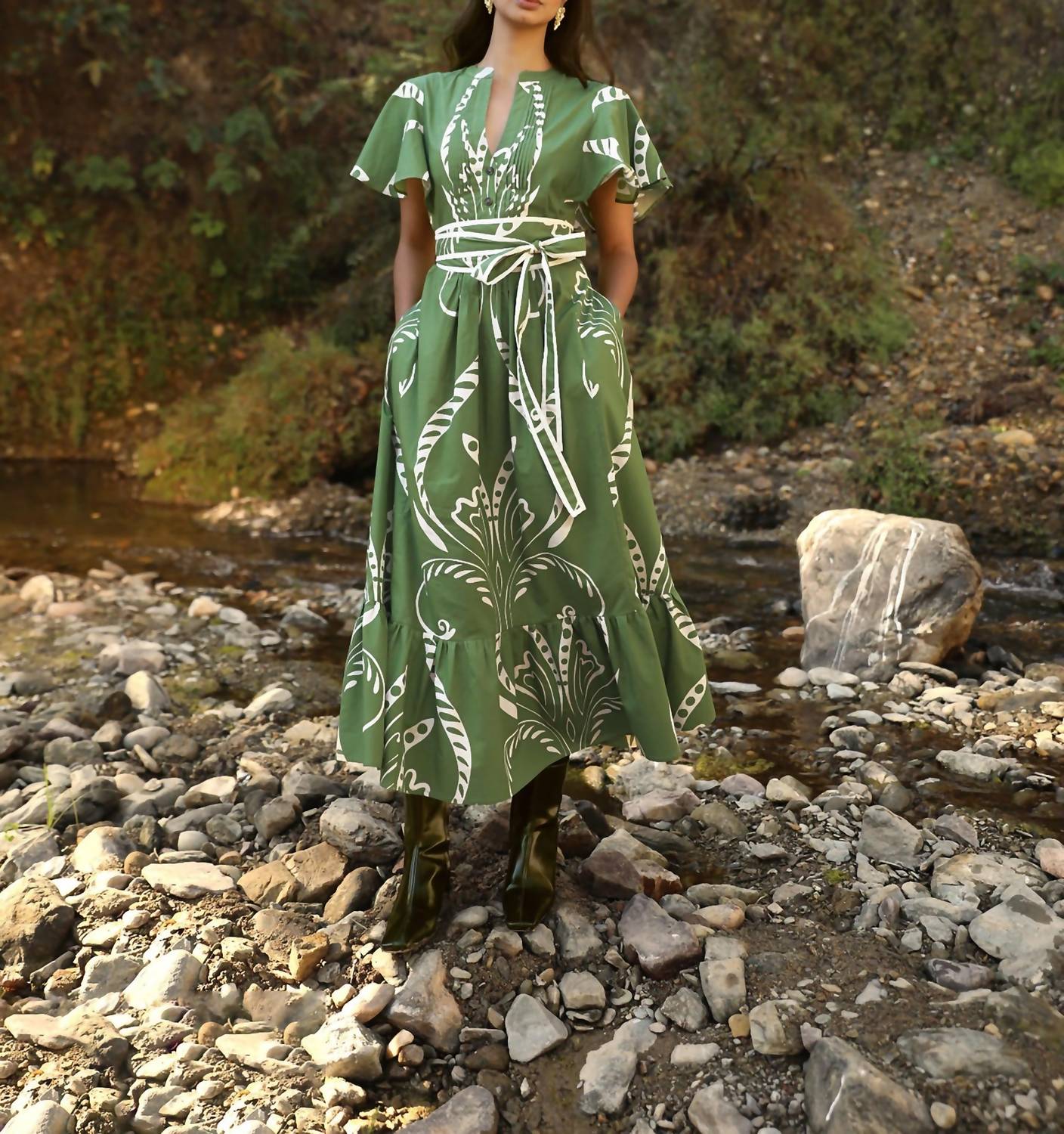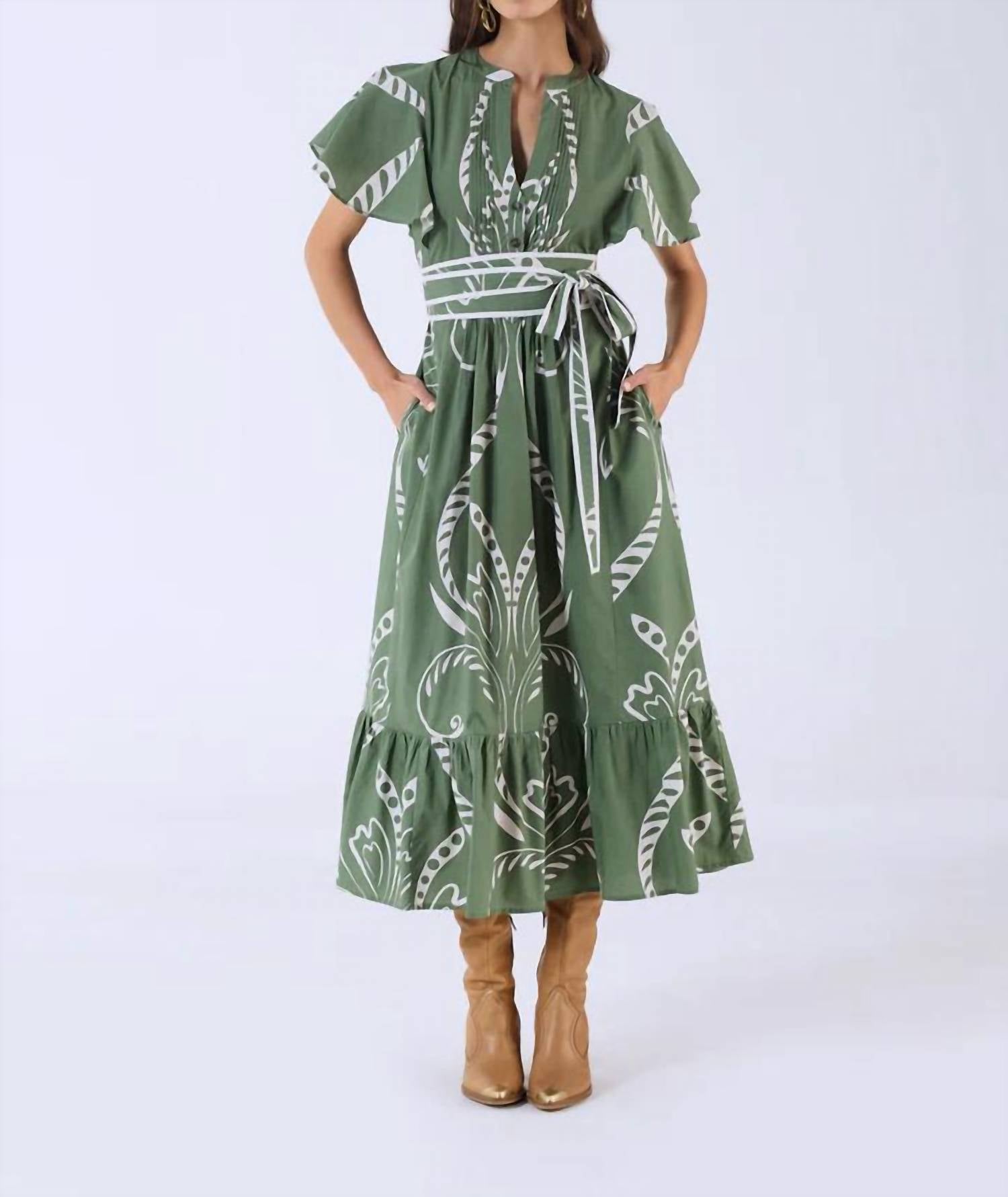 Just add slides or mules and you are good to go. Introducing the Leni Dress by BEYOND by Vera in an enchanting Fountain Green print. This dress features short flutter sleeves and is crafted from 100% cotton poplin, offering a breathable, soft touch. With a midi length and button closure, it includes thoughtful details such as subtle pleats and a ruffled hem for a universally flattering fit. Perfect for vacation and capturing the boho chic trend, it comes with wash instructions for machine wash cold on a gentle cycle and line dry.