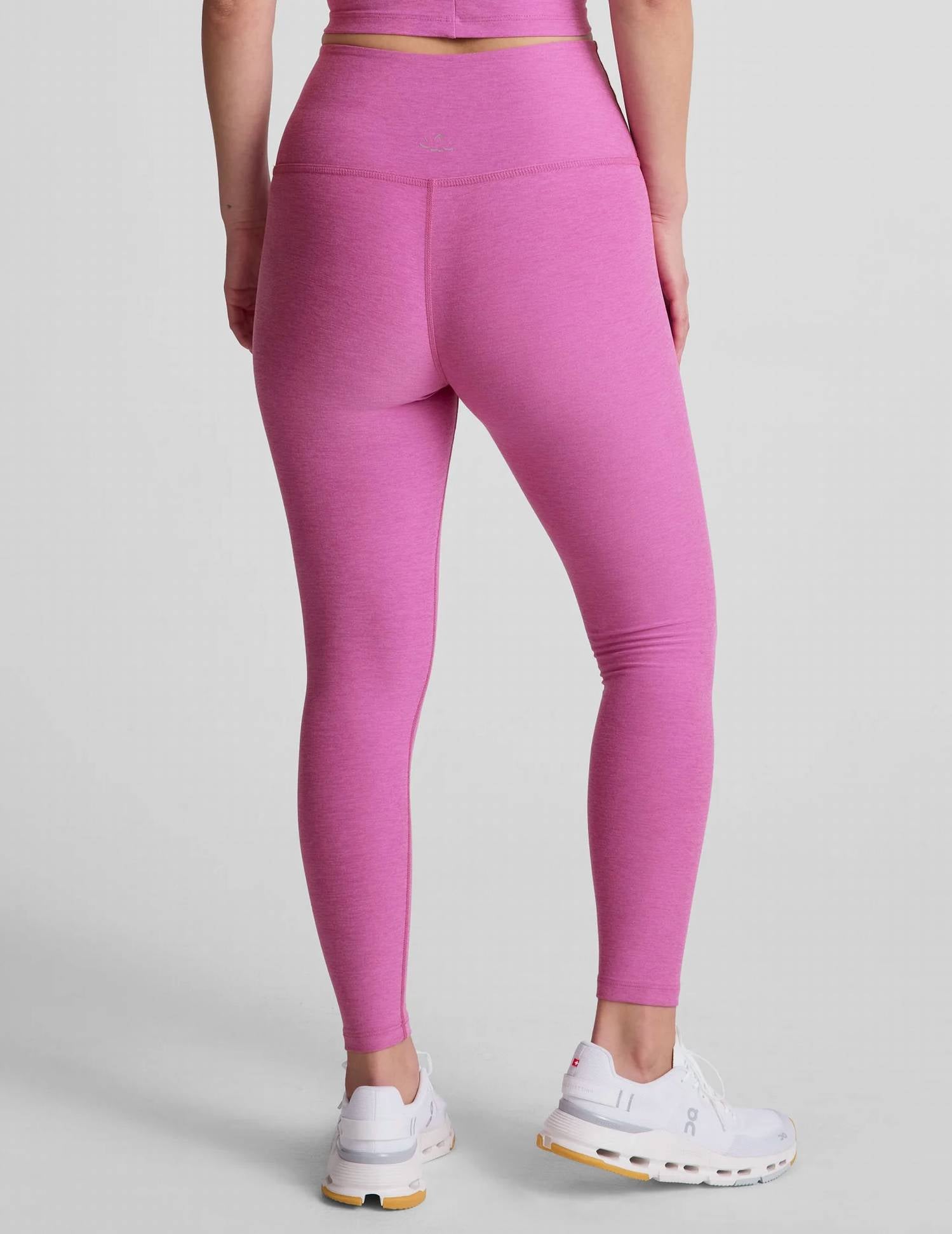 Leggings you can dress up or down for any occasion. Introducing the Spacedye Caught In The Midi High Waisted Legging by BEYOND YOGA, an essential addition to any wardrobe in elegant Sunset Violet Heather. These leggings boast a 5” high waistband and are constructed from buttery soft polyester with a midi length 24" inseam, ensuring a comfortable fit that sits at the natural waist with no outside seams. Offering gentle, supportive compression for a flawless silhouette, perfect for fitness or lounging.