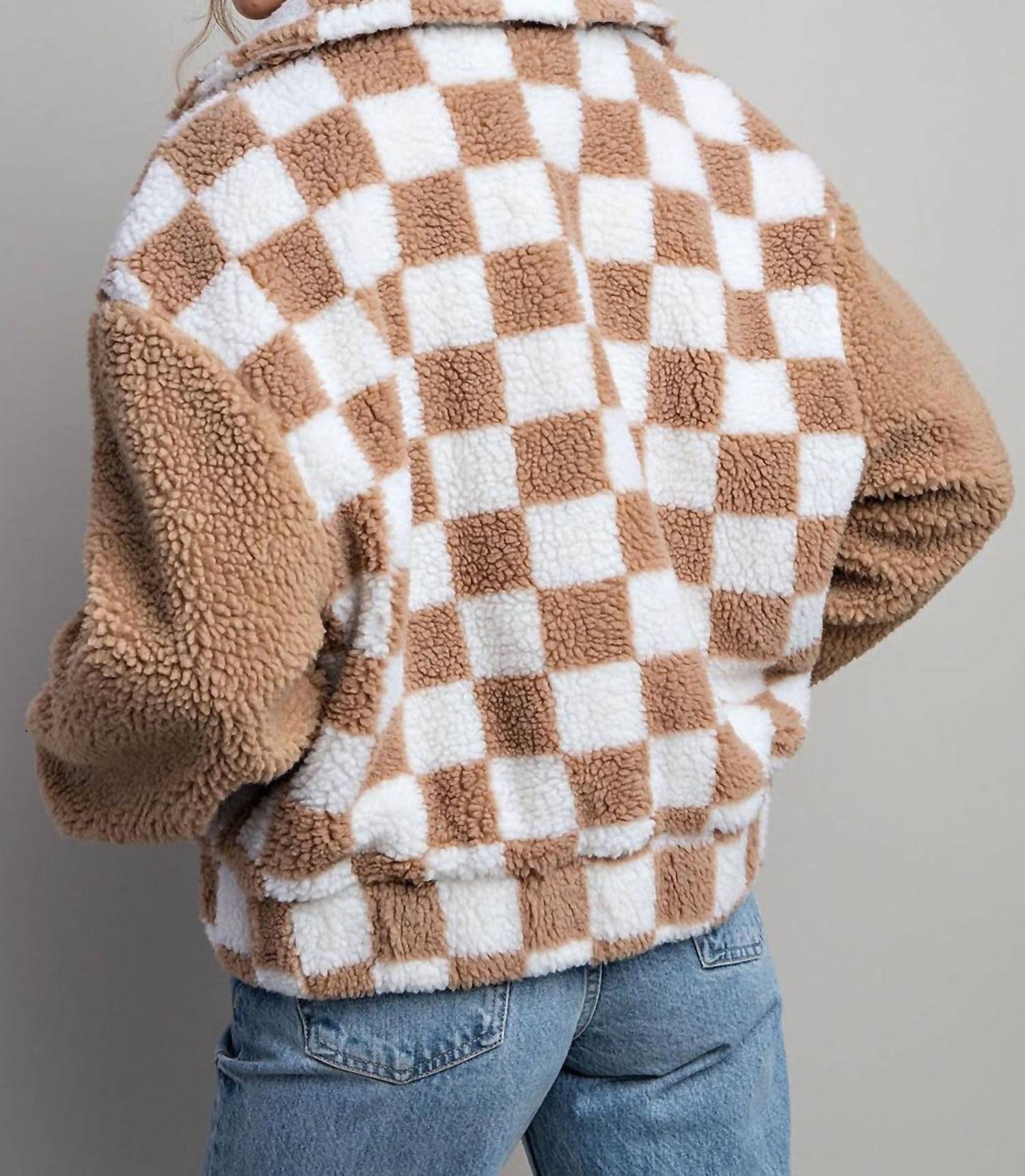 Colder weather means jacket season and we are loving everything about this timeless teddy jacket. Embrace winter streetwear with the Calli Checkered Jacket by BiBi, a standout piece in brown and white checks. Designed with long sleeves and crafted from 100% polyester, this teddy jacket offers classic comfort and style. Features include a practical zip closure and convenient pockets. Care: Dry clean only. Origin: Imported. Ideal for travel and versatile enough for various occasions.