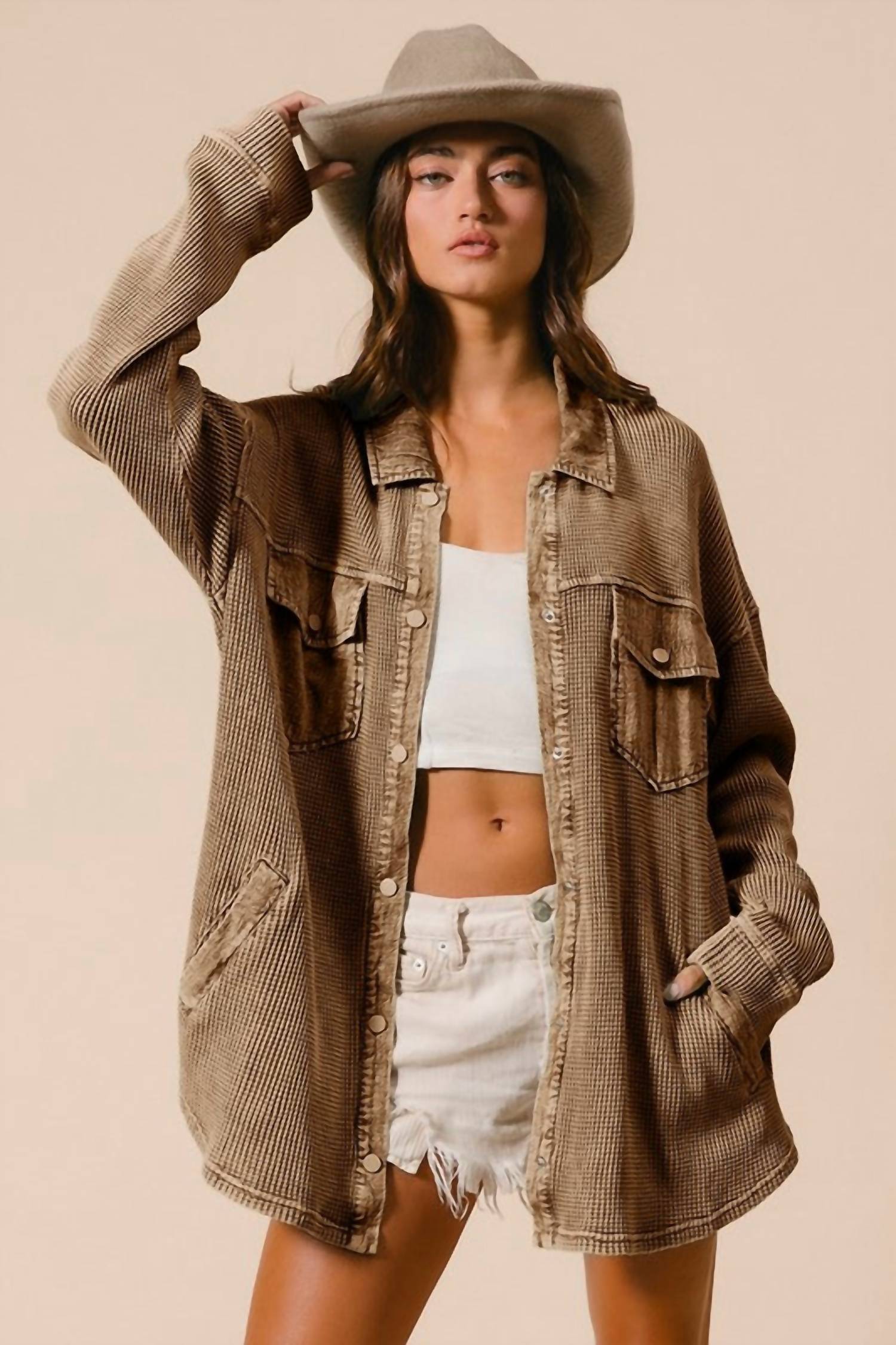 Cute, casual, and comfortable. This jacket is a must have. Discover the Codie Shacket by BiBi, a stylish blend of comfort and functionality with its textured taupe mineral-washed design. This casual women's jacket features a classic collar and long sleeves, perfect for layering. The shacket includes practical pockets and a convenient button closure to suit your versatile wardrobe needs. A must-have piece for a chic yet relaxed look.